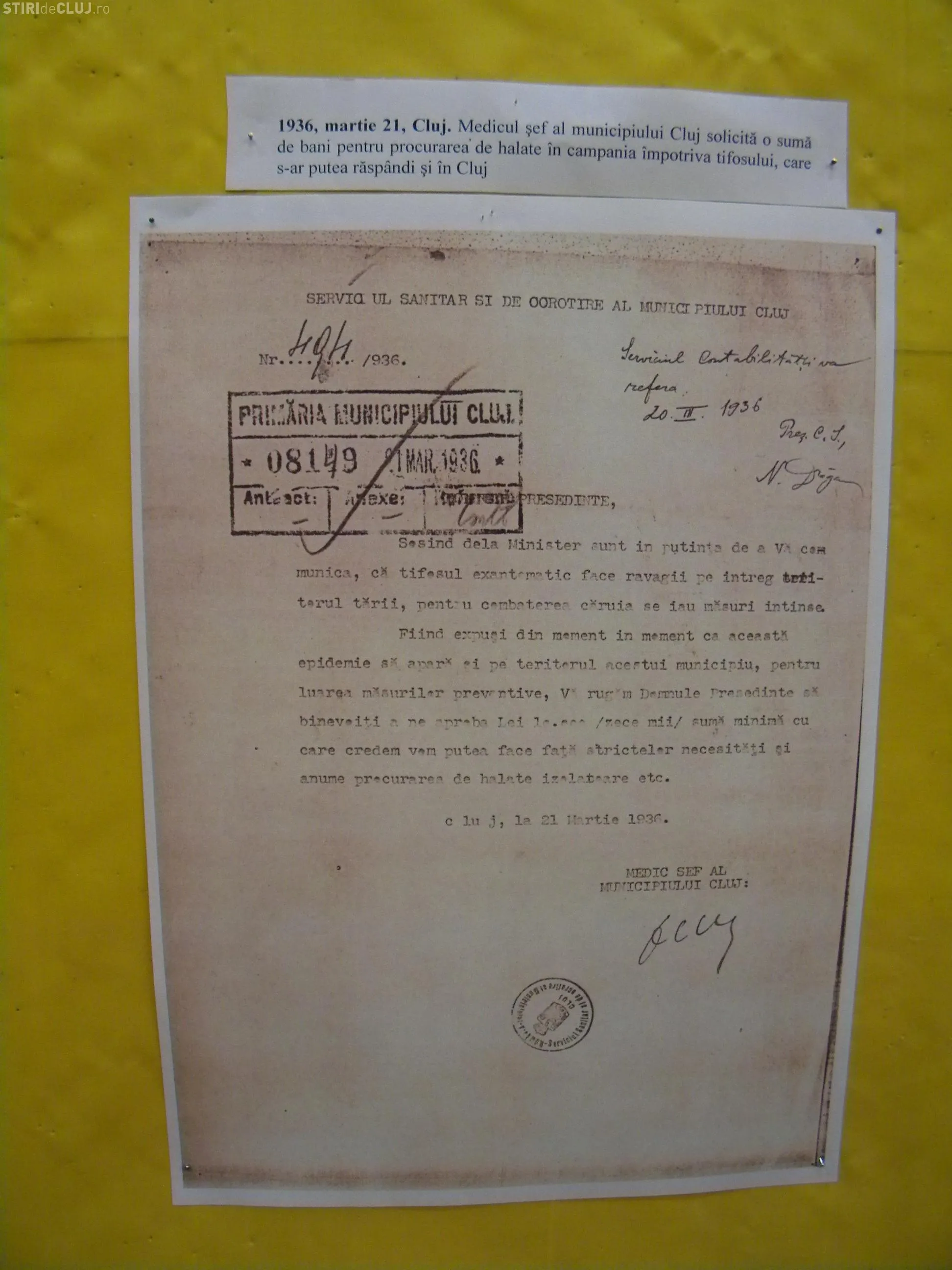 "Din expozitie fac parte cereri catre Primaria Cluj inregistrate din partea cetatenilor pe diverse probleme edilitare, culturale si sportive, planuri de constructie din perioada interbelica aprobate de Primaria Cluj, imagini cu aspecte de la constructia Catedralei Ortodoxe din Piata Avram Iancu si de la constructia Liceului Sfanta Terezia, actualul Colegiu George Cosbuc sau colaje cu imagini cuprinzand functionari publici din serviciile Tehnic si Financiar a Primariei Cluj-Napoca", se arata intr-un comunicat al Biroului de presa al Primariei.