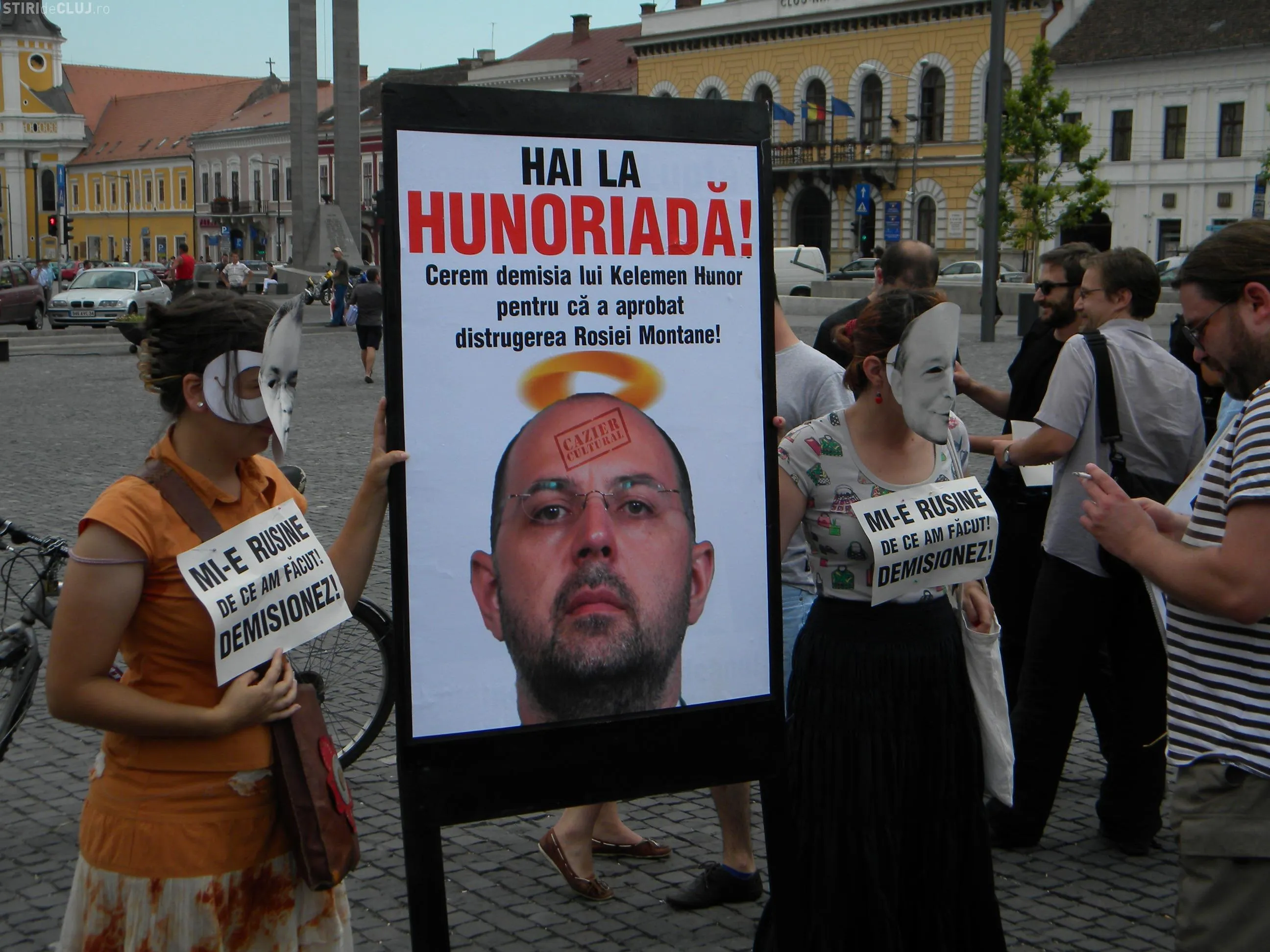 Protestatarii adunati in Piata Unirii din Cluj-Napoca, pentru a spune NU exploatarii cu cianuri la Rosia Montana, au jucat o sceneta in care i-au ironizat pe Kelemen Hunor, Basescu, Boc si pe ministrul Mediului, Laszlo Borbely.