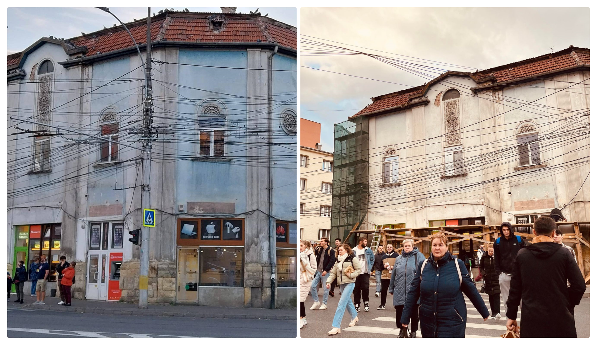 Clădirea din Piața Mihai Viteazu, colț cu strada Cuza Vodă, catalogată drept cel mai kitschos colț din centrul Clujului, a intrat în renovare, după ce Știri de Cluj a scris recent un material.