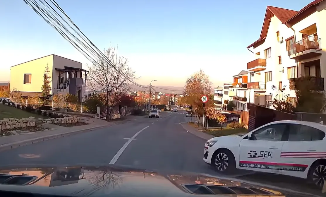 „Încă un șofer care cobora de pe str. Kos Karoli pe str. Eugen Ionesco și se baza pe prioritatea de stânga, ignorând semnul de „cedează trecerea”. Accident evitat la limită.”, a scris șoferul în descrierea videoclipului.