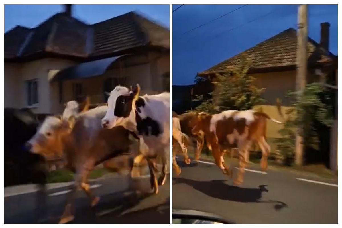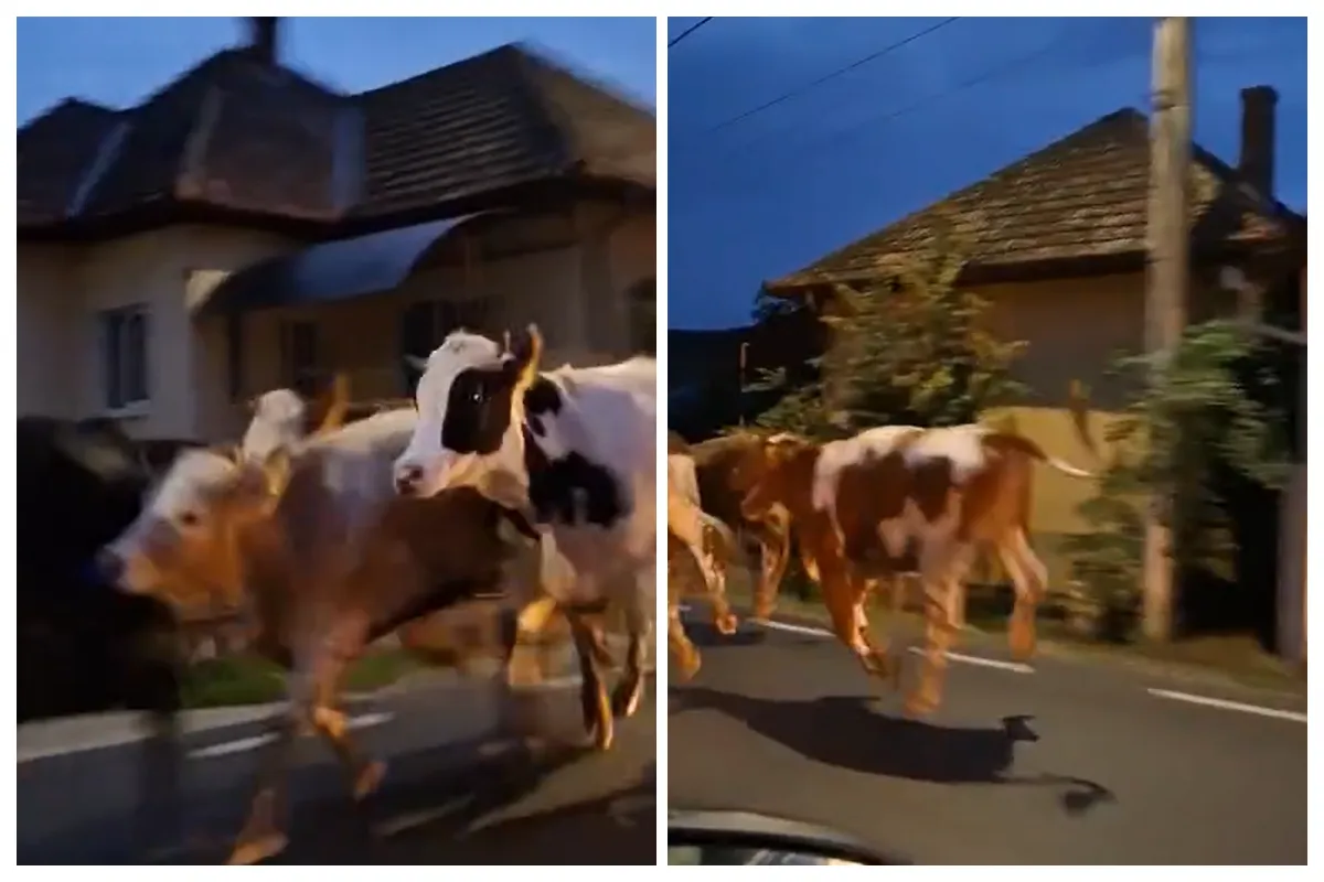 În această dimineață, mai multe vaci au fost surprinse alergând pe marginea drumului principal din comuna Chinteni, vizibil speriate de traficul local. Deși animalele nu blochează încă carosabilul, există riscul ca una dintre ele să sară brusc în fața unei mașini, punând în pericol atât șoferii, cât și pietonii.