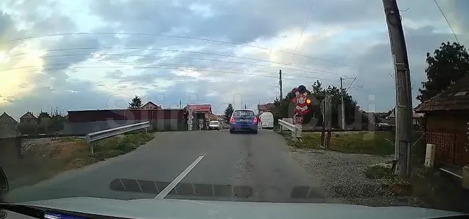Situație periculoasă pe Drumul 161A, dinspre Cojocna spre Apahida, în care un șofer a trecut cu tupeu peste calea ferată, ignorând complet semnalele luminoase și acustice care avertizau apropierea trenului.