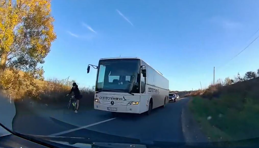 Incidentul a fost surprins chiar de camera de bord a șoferiței. În imagini se vede cum autocarul, aflat într-o zonă cu linie continuă, intră în depășirea a trei bicicliști care circulau unul după altul. Fără să țină cont de curba din față sau de faptul că din sens opus venea o mașină, șoferul autocarului a pătruns adânc pe contrasens, ocupând jumătate din banda femeii.