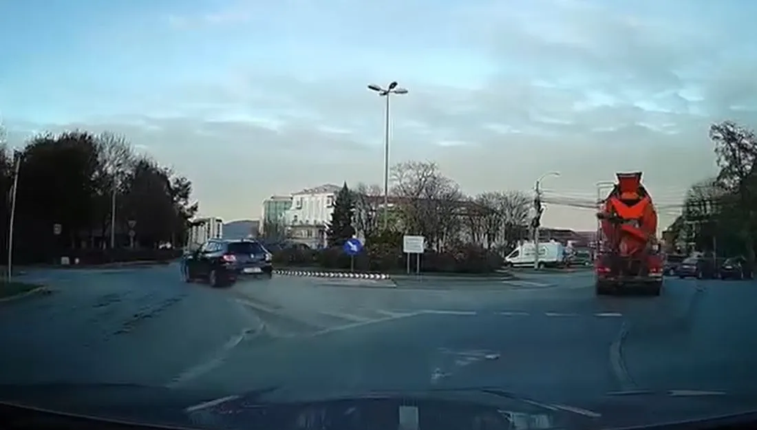 După doar cinci secunde de așteptare, șoferul și-a pierdut răbdarea și a decis să depășească betoniera chiar în sensul giratoriu, însă ocolind rondoul pe partea stângă, pe contrasens . Manevra este extrem de periculoasă și putea să ducă la coliziuni grave cu alte mașini sau bicicliști aflați în zonă.