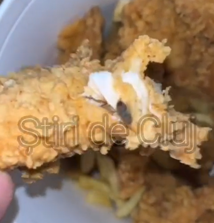 Un tânăr din Cluj a avut parte de o surpriză dezgustătoare astăzi, 18 septembrie, în jurul orei 16:36, când și-a cumpărat un American Bucket de la unul dintre cele mai cunoscute fast-food-uri din lume, conținând 10 Hot Wings și 10 Crispy Strips, pentru care a plătit 88.80 de lei. În timp ce savura mâncarea, aceasta nu a mai părut deloc apetisantă, când a descoperit un vierme pe una dintre bucățile din American Bucket.