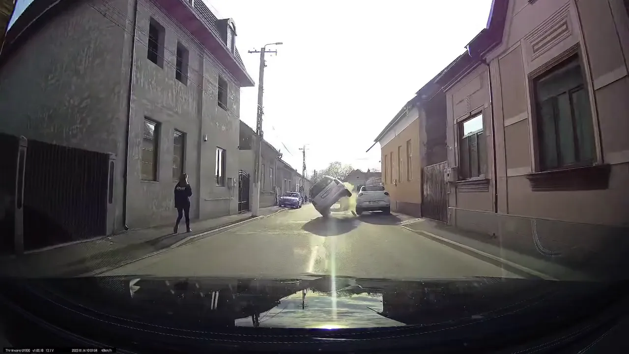 Cel mai probabil, șoferul care s-a răsturnat stătea pe telefonul mobil și nu a estimat corect obstacolul. Mașina parcată a fost lovită în partea din spate, iar șoferul vinovat s-a răsturnat spectaculos. Din fericire, nimeni nu a pățit nimic.