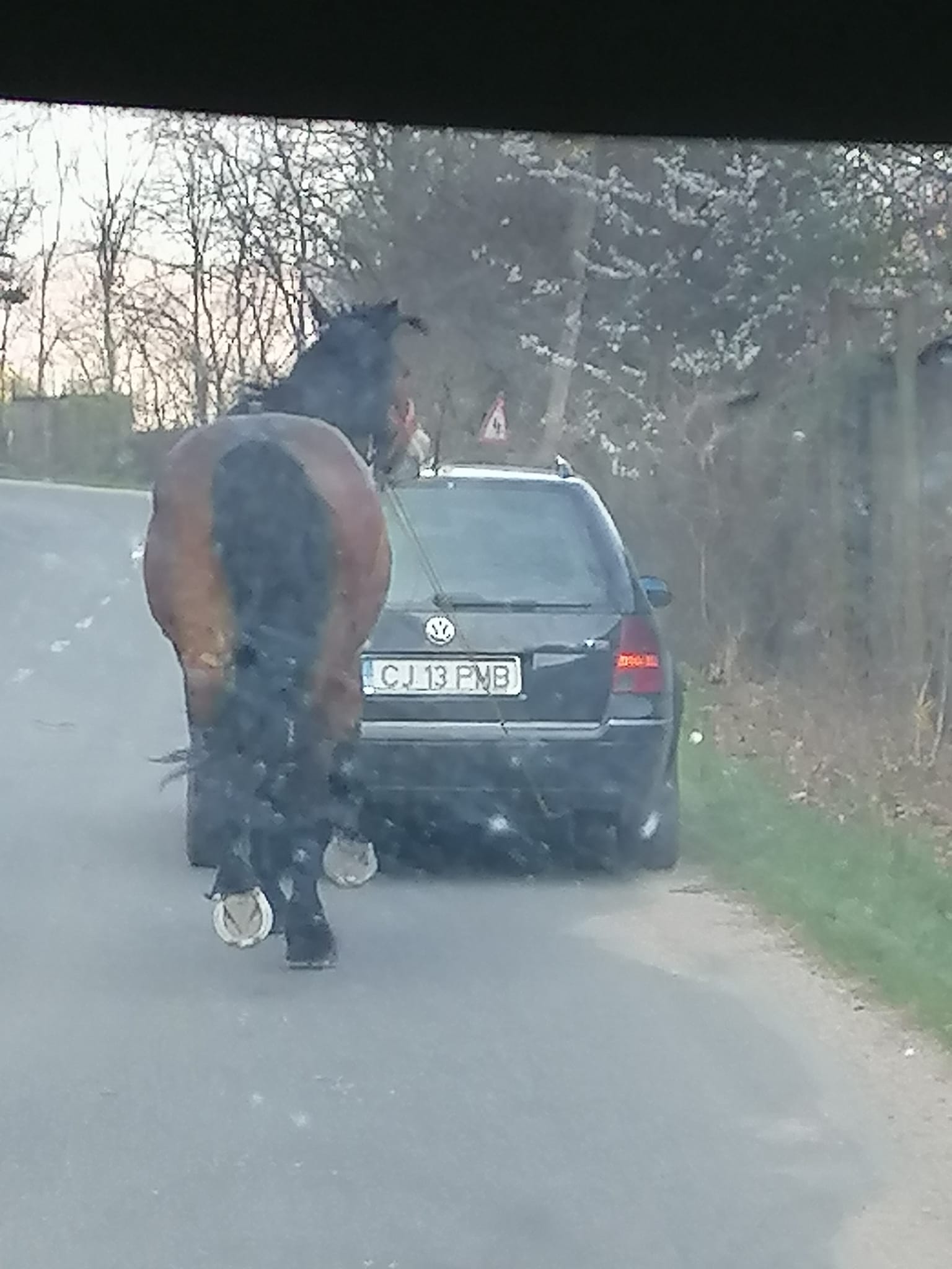 Alături de mașina în mișcare ce trăgea animalul în urma ei, se mai afla un cal care, deși nu era legat, încerca să țină pasul cu celălalt necuvântător. Problema cu cel de-al doilea cal a apărut în momentul în care acesta a început să se îndepărteze de mașină, mergând literalmente pe mijlocul drumului, punându-și viața în pericol din cauza mașinilor care circulau pe șosea.