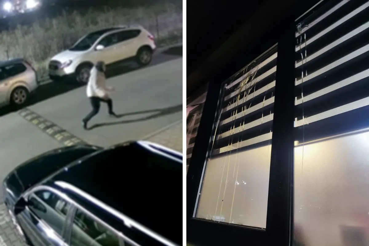 Incidentul a fost surprins de o cameră de supraveghere amplasată în zonă, iar videoclipul a fost postat pe rețelele de socializare, alături de o imagine cu geamul spart.