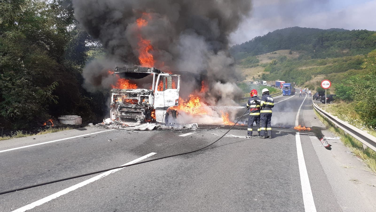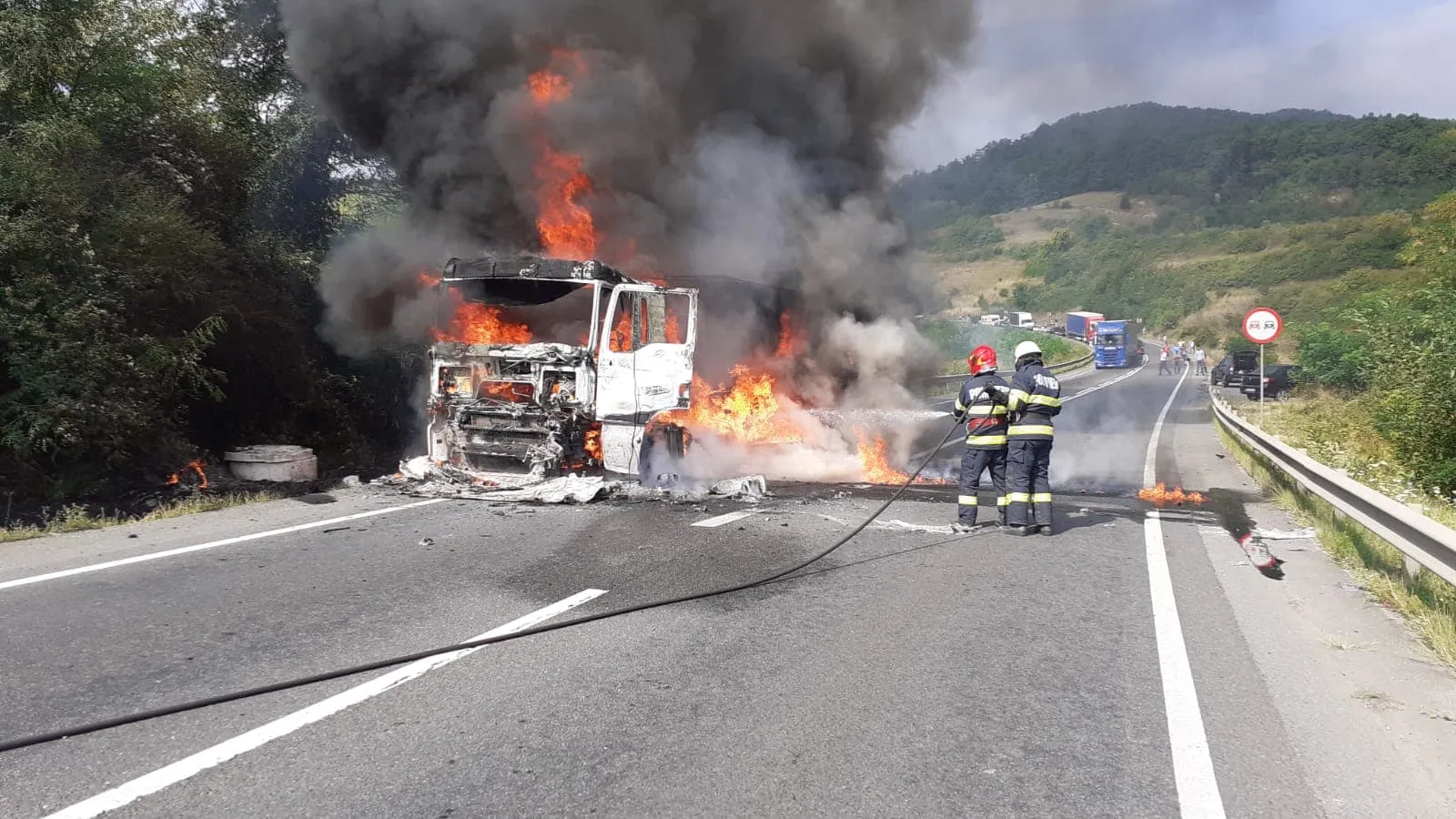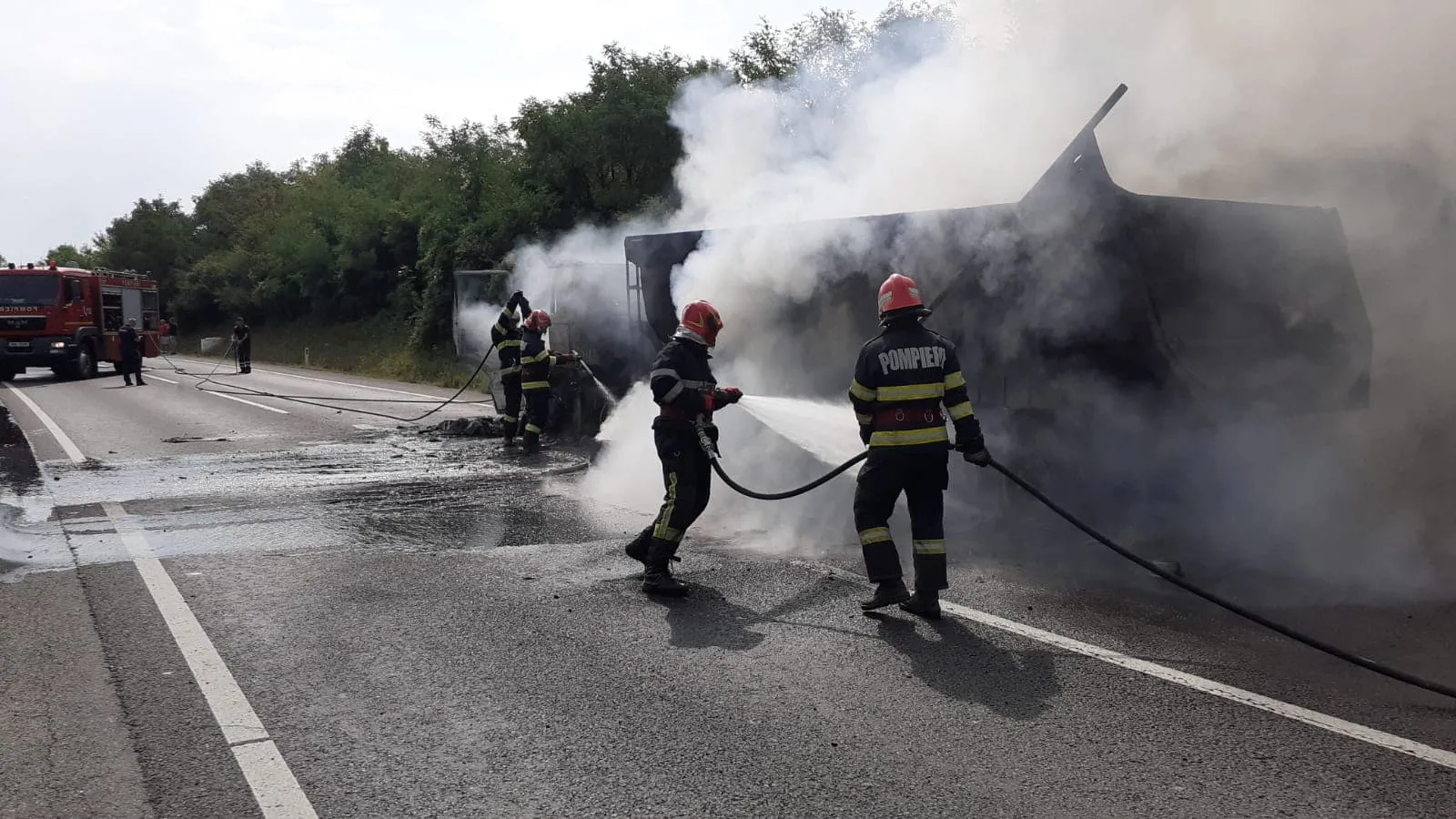 Din primele informații, nu au fost persoane care să solicite consult medical, iar cauza probabilă a incendiului a fost o defecțiune la motorul autocamionului.