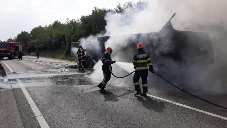 Pompierii clujeni intervin în aceste momente cu trei autospeciale pentru stingerea flăcărilor care au cuprins un autocamion ce se deplasa pe drumul DN1E60, pe raza localității Dumbrava.