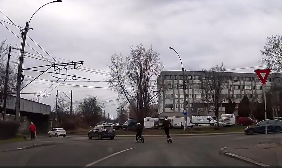 Un incident periculos a fost surprins ieri, în jurul orei 15:00, în Piața 1 Mai din Cluj-Napoca, de camera de bord a unui autoturism. În imagini apar doi tineri, unul pe o bicicletă electrică și celălalt pe o trotinetă electrică, care circulă haotic, punând în pericol atât propria siguranță, cât și pe cea a șoferilor din trafic.