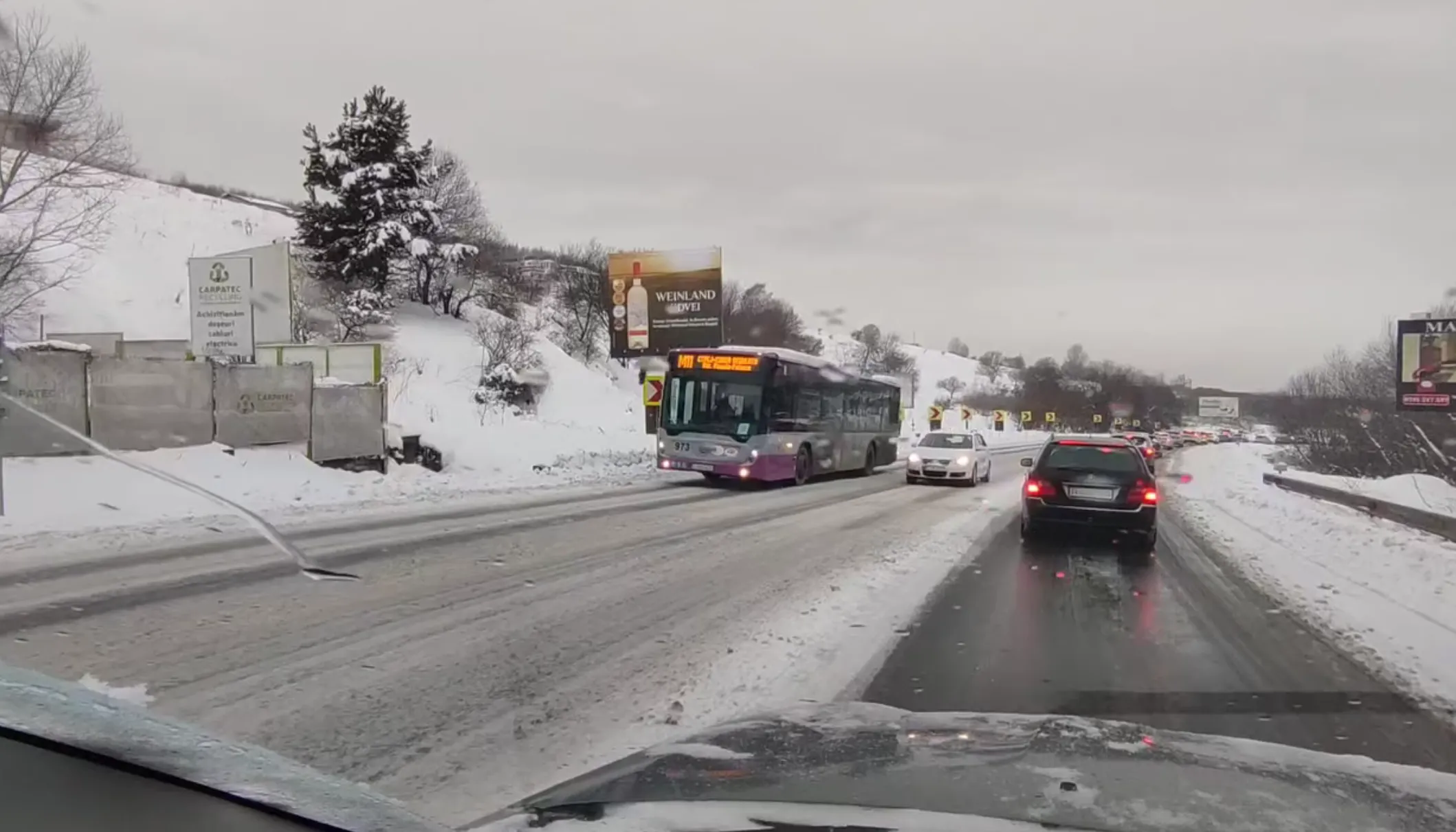 Pe Dealul Feleacului, urcarea a devenit aproape imposibilă pentru autoturismele obișnuite. Autobuzul M11, spre Feleacu, a avansat cu o viteză de doar 5 km/h, iar călătorii au resimțit întreaga tensiune a traficului înghețat. Șoferii recomandă prudență maximă, întrucât panta și carosabilul alunecos pot transforma orice manevră obișnuită într-o experiență riscantă.
