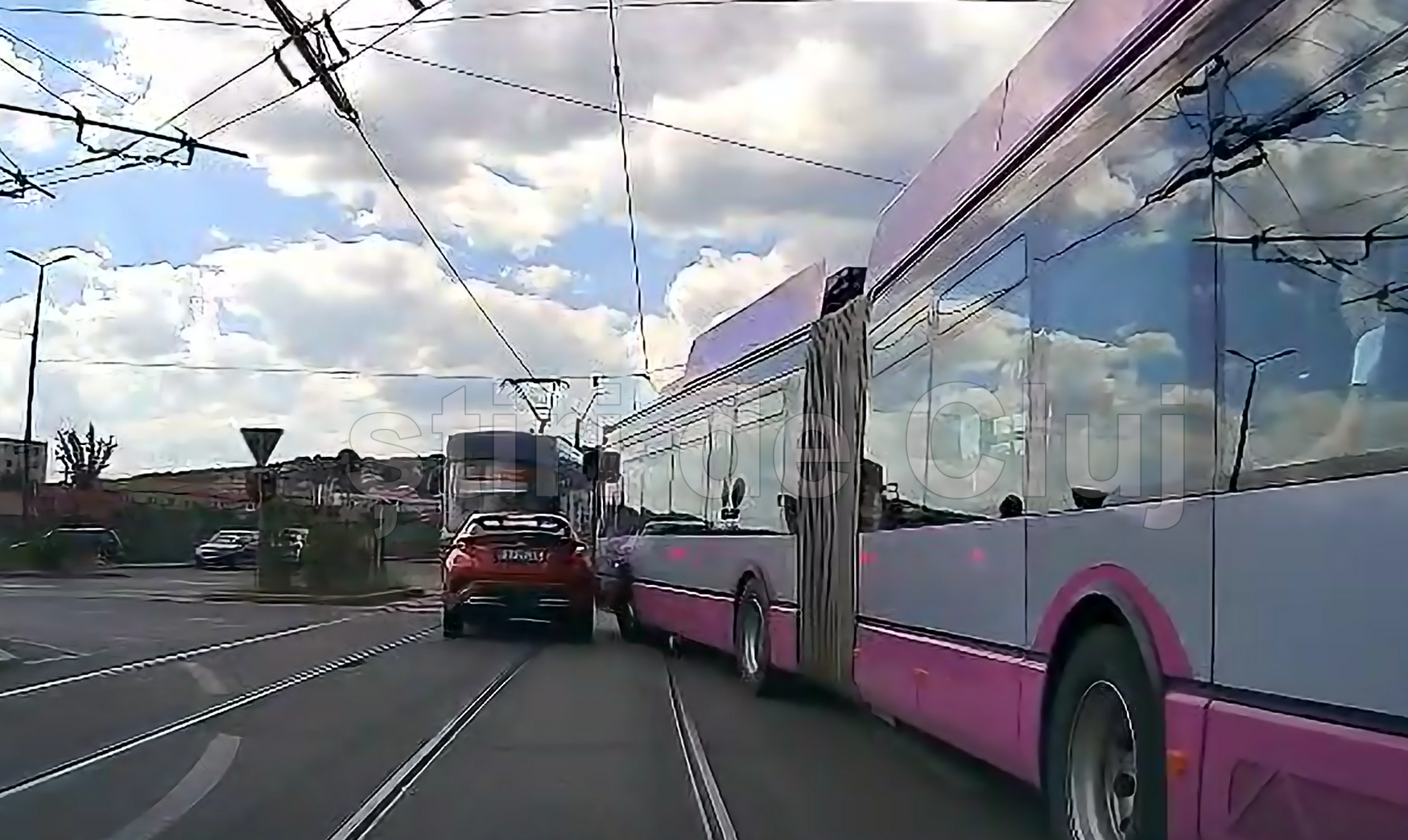 VIDEO. Șofer aproape făcut „acordeon” la Cluj, între tramvai și troleu, în zona Auchan Iris. A scăpat ca prin urechile acului: „Sigur i-a înghețat inima”