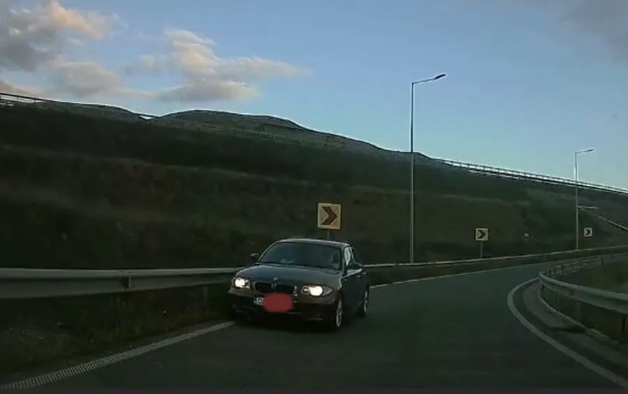 În imaginile video se vede cum BMW-ul pătrunde pe banda greșită și se deplasează lent, aproape lipit de parapetul din dreapta. Reacția celui care filma a fost de șoc, căci mașina venea direct spre el și trebuia să se adaptateze rapid pentru a evita un posibil accident.