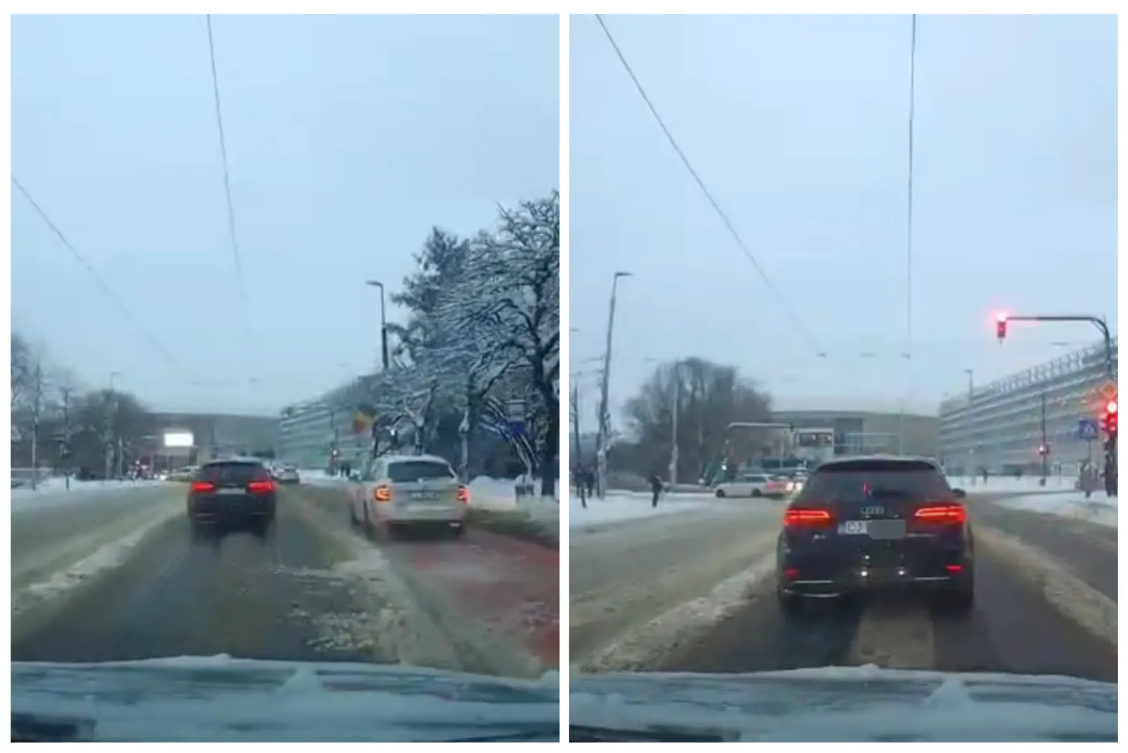 Părea că nimic nu-l poate opri: Nici carosabilul acoperit parțial de zăpadă, nici semaforul. Nimic!