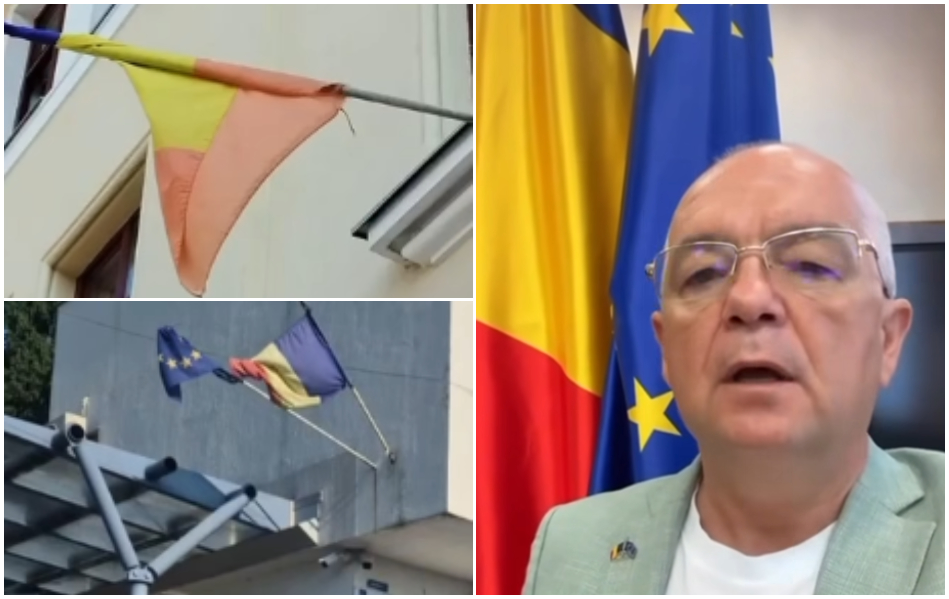 Mai mult, avertizează instituțiile publice să spele mai des steagurile arborate pentru a nu risca amenzi de 1.000 de lei. „Ceea ce ați văzut nu poate fi tolerat și acceptat (n.r. referire la fotografia de mai jos). Respectul pentru drapelul României este respectul pentru noi înșine.