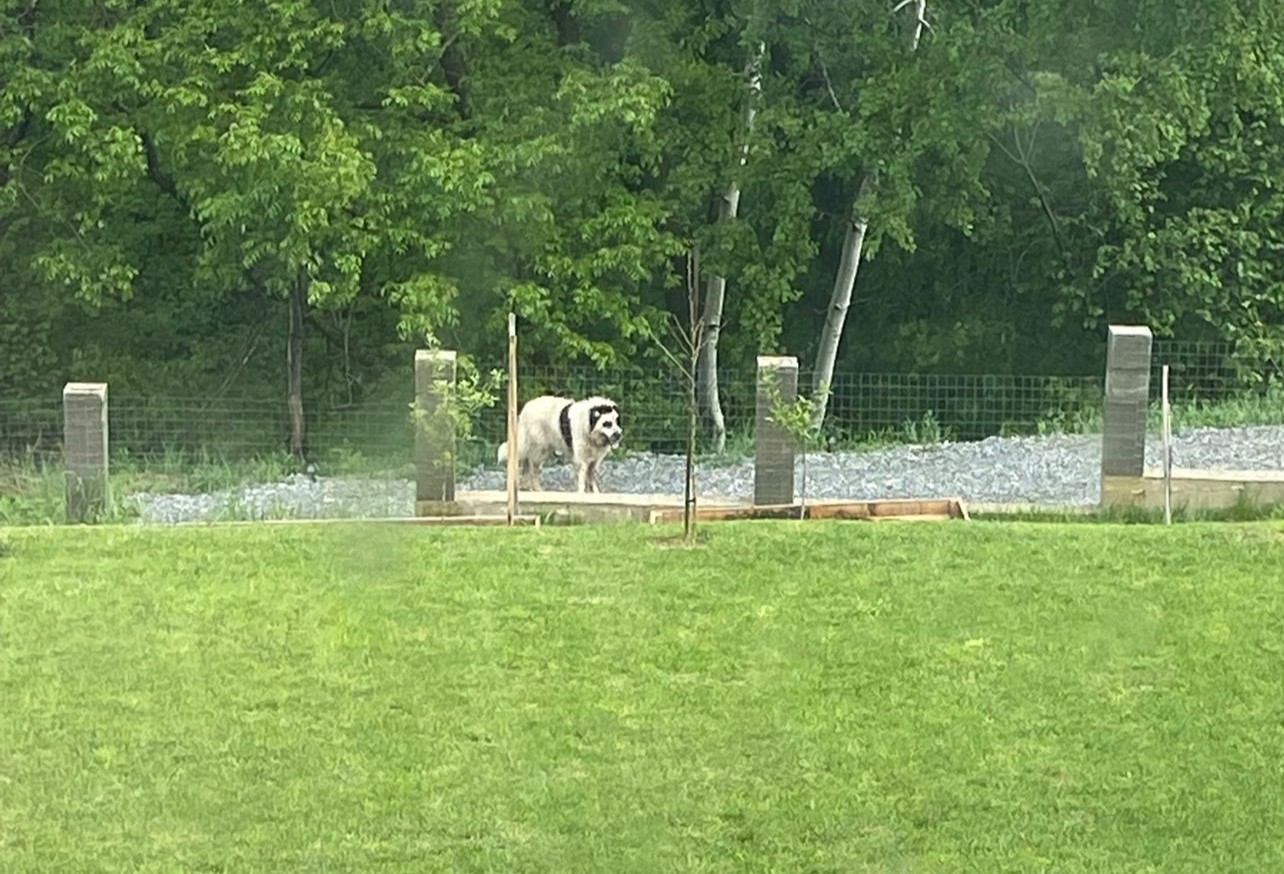 Un câine ciobănesc de talie mare, alb cu negru, a fost surprins în comuna Feleacu, județul Cluj, în timp ce manifestă un comportament neobișnuit.