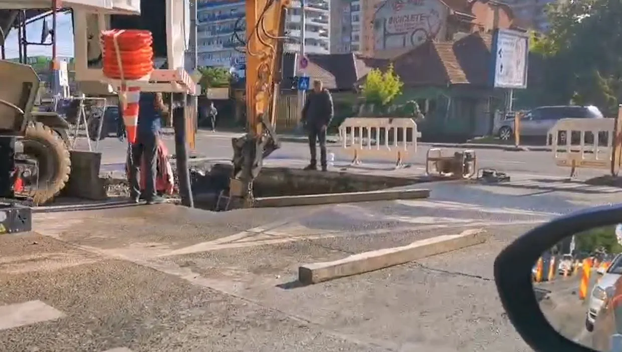 VIDEO Un „crater” uriaș a fost săpat în asfalt în Cluj-Napoca: Traficul a fost îngreunat de lucrări pe strada Dorobanților, la capătul dinspre Iulius Mall