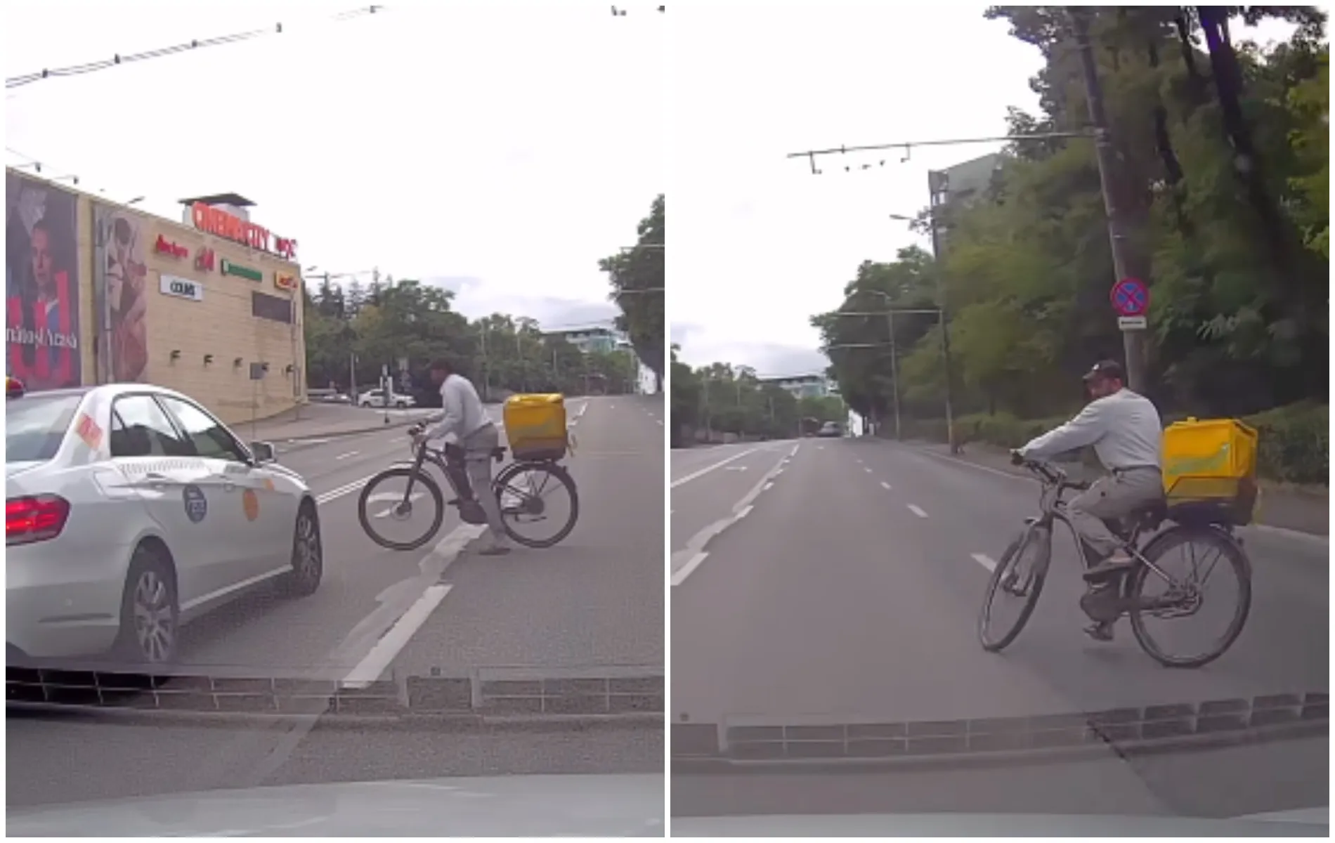 În filmare se vede cum livratorul, pe bicicletă, îi sare șoferului nostru în față de după un troleibuz. Neimpresionat de faptul că tocmai a scăpat de un accident grav, omul nostru își vede de drum și are noroc, din nou, de un șofer de Taxi care încetinește la timp.