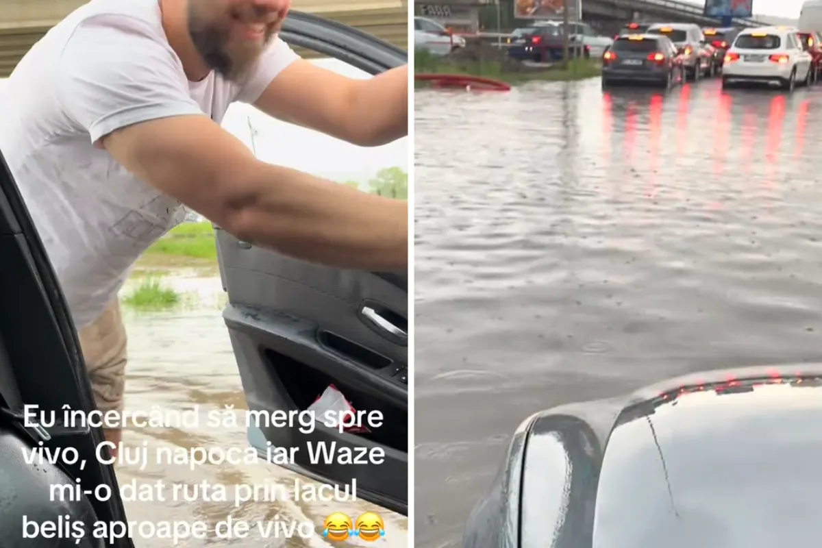 Ploaia zdravănă de sâmbătă, 26 aprilie 2025, a transformat parcarea Vivo Cluj într-un adevărat lac de acumulare. Cu toate acestea, pentru un tânăr clujean, necazul a fost doar un nou prilej de glume.