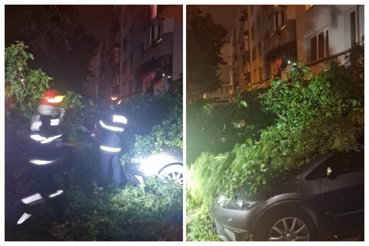 Vijelia din seara asta a făcut ravagii: 3 mașini distruse de un copac care a căzut peste ele în Grigorescu. Alt copac a căzut peste o mașină în Gheorgheni