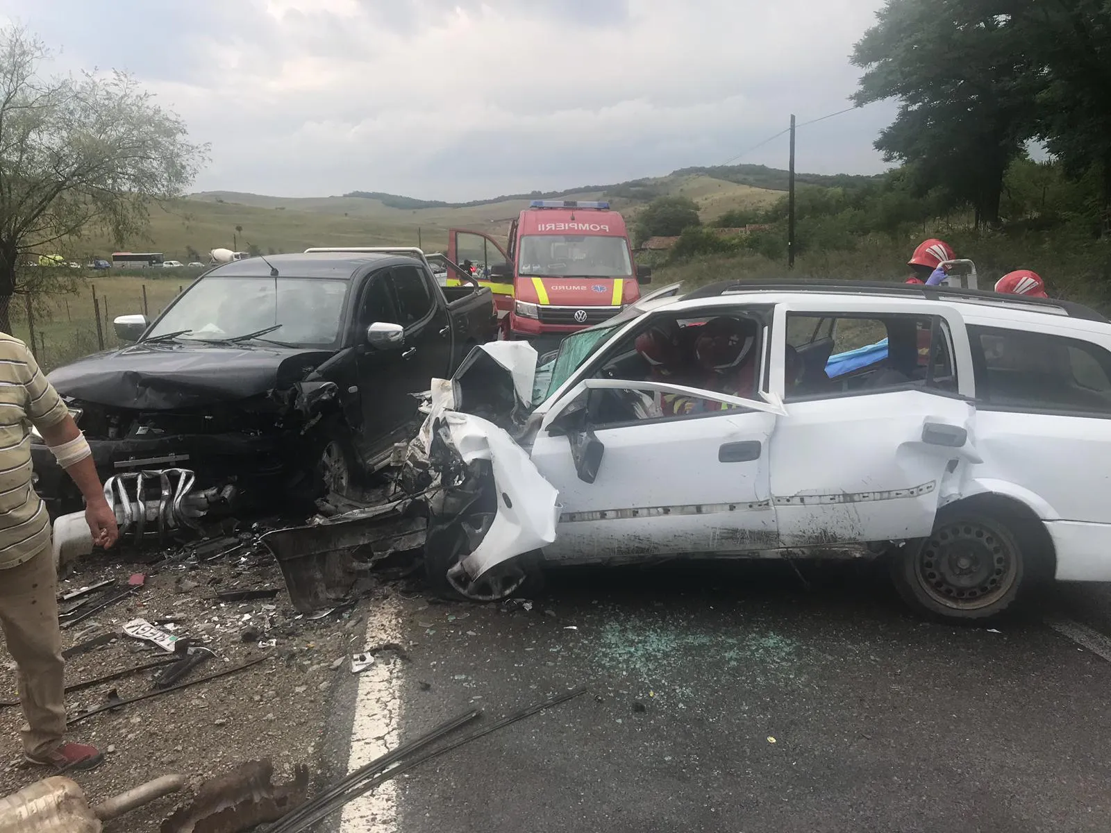 Pompierii au intervenit pentru a descarcera o femeie, de cca 20 de ani, care a rămas blocată într-unul dintre autoturismele implicate în accident și care suferise multiple traumatisme. S-a efectuat imediat extragerea acesteia folosind echipamentele speciale, astfel încât să evite agravarea leziunilor suferite.