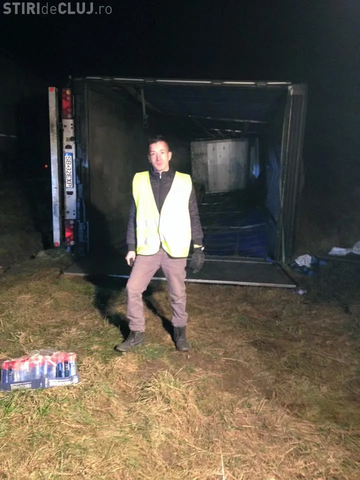 Mai mulți voluntari clujeni, în frunte cu cunoscutul artist Cosmin Gabor, participant la multe concursuri de talente, au da to mână de ajutor la mutarea sacilor cu haine pentru persoane nevoiașe, din TIR -ul răsturnat pe DN 1, în Florești.
