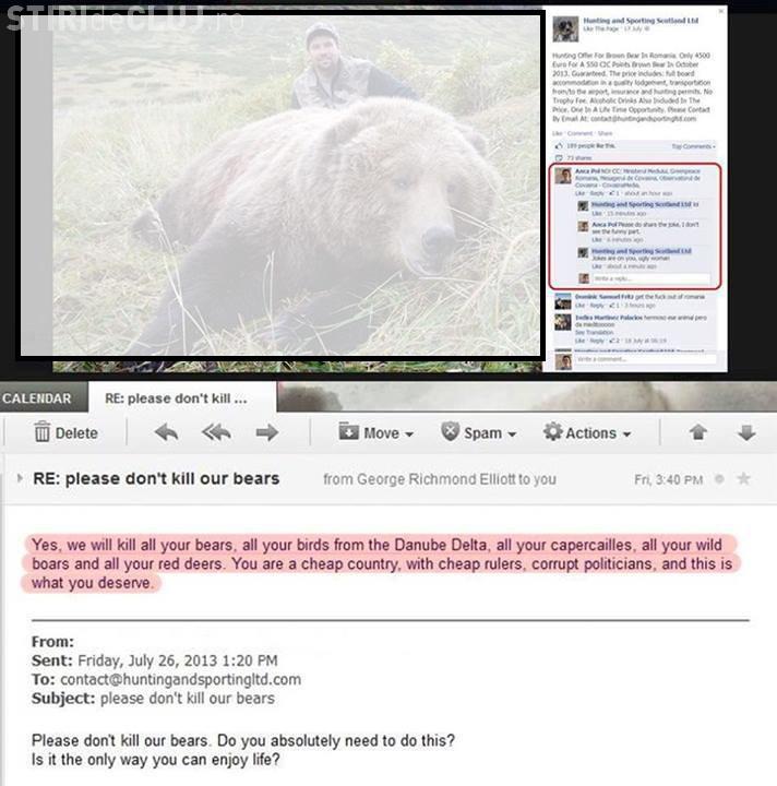 Indignată de fotografia postată, cu un urs brun împușcat, o româncă i-a scris lui George Richmond Elliott de la Hunting and Sporting Scotland Ltd: ”Vă rog nu ne ucideţi urşii. Trebuie să faceţi asta neapărat? Asta este singura modalitate prin care vă puteţi bucura de viaţă?”.