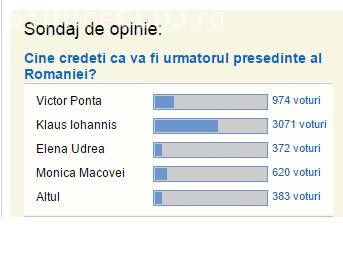 Sondajul facut de Stiri de Cluj printre cititori, fara a fi unul sociologic, a stabilit cu exactitate ierarhia primilor trei candidati la alegerile prezidentiale din 2 noiembrie, desi in sondaj au fost inclusi doar patru dintre candidati, ceilalti fiind inclusi la categoria "alt candidat". Astfel, din totalul de 5340 de voturi exprimate pe site, 3071 au fost pentru Klaus Iohannis, adica 57,5%. Pe locul doi s-a situat Victor Ponta cu 974 voturi, adica 18%, iar pe locul trei, Monica Macovei cu 620 de voturi, reprezentand 11.6%.