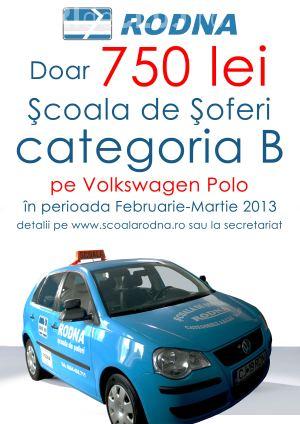În perioada februarie-martie 2013, la Rodna poți face școala de șoferi pentru categoria B pe Volkswagen Polo la doar 750 de lei.
