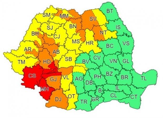 În jumătatea de vest a Olteniei, sudul Banatului, zona Carpaților Occidentali, nordul Carpaților Orientali și vestul Carpaților Meridionali vor fi averse torențiale, descărcări electrice, intensificări de scurtă durată ale vântului și izolat vijelii și grindină.