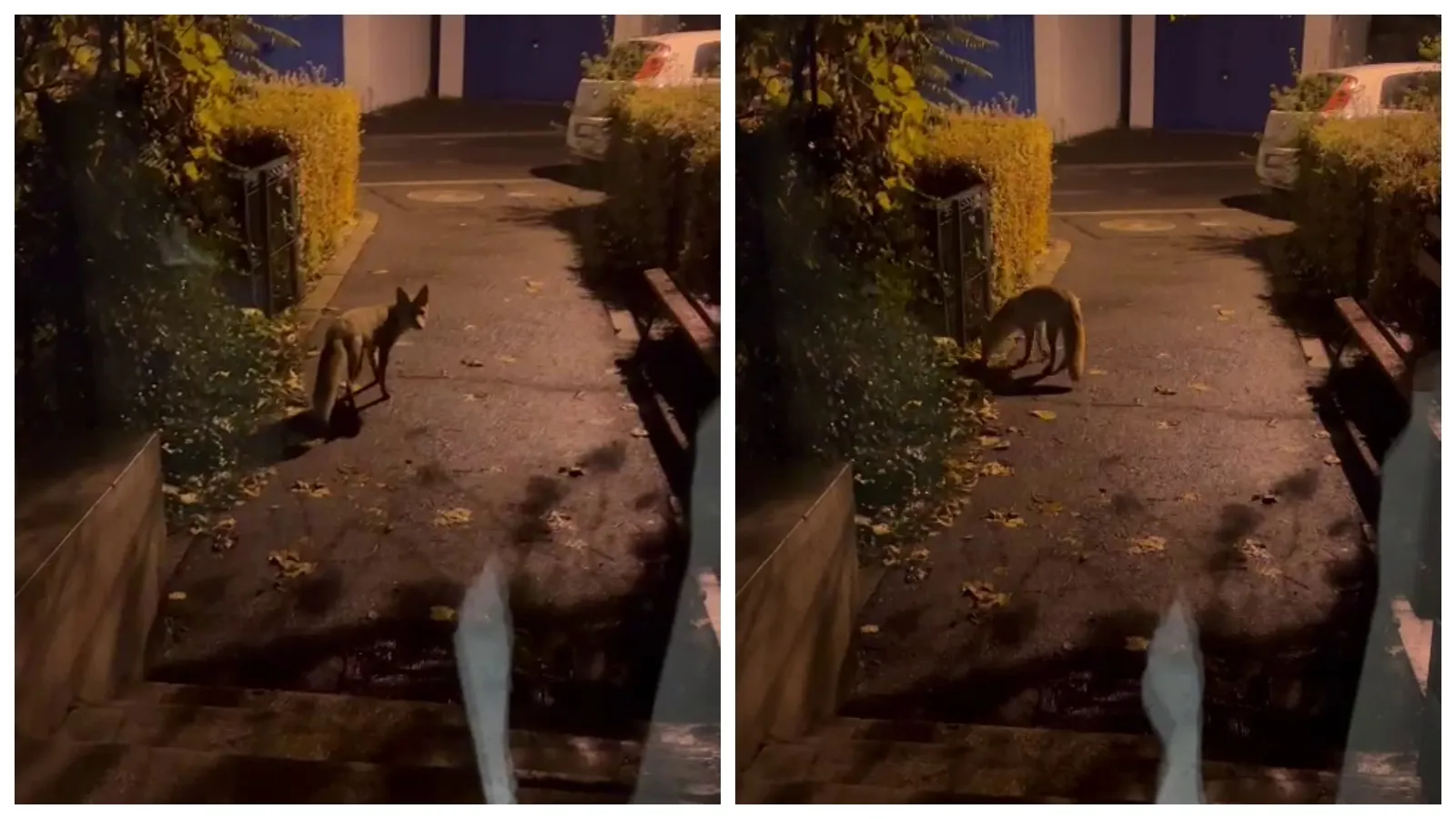 Vulpea nu pare deloc speriată de prezența oamenilor, semn că este obișnuită să se aventureze în cartier.