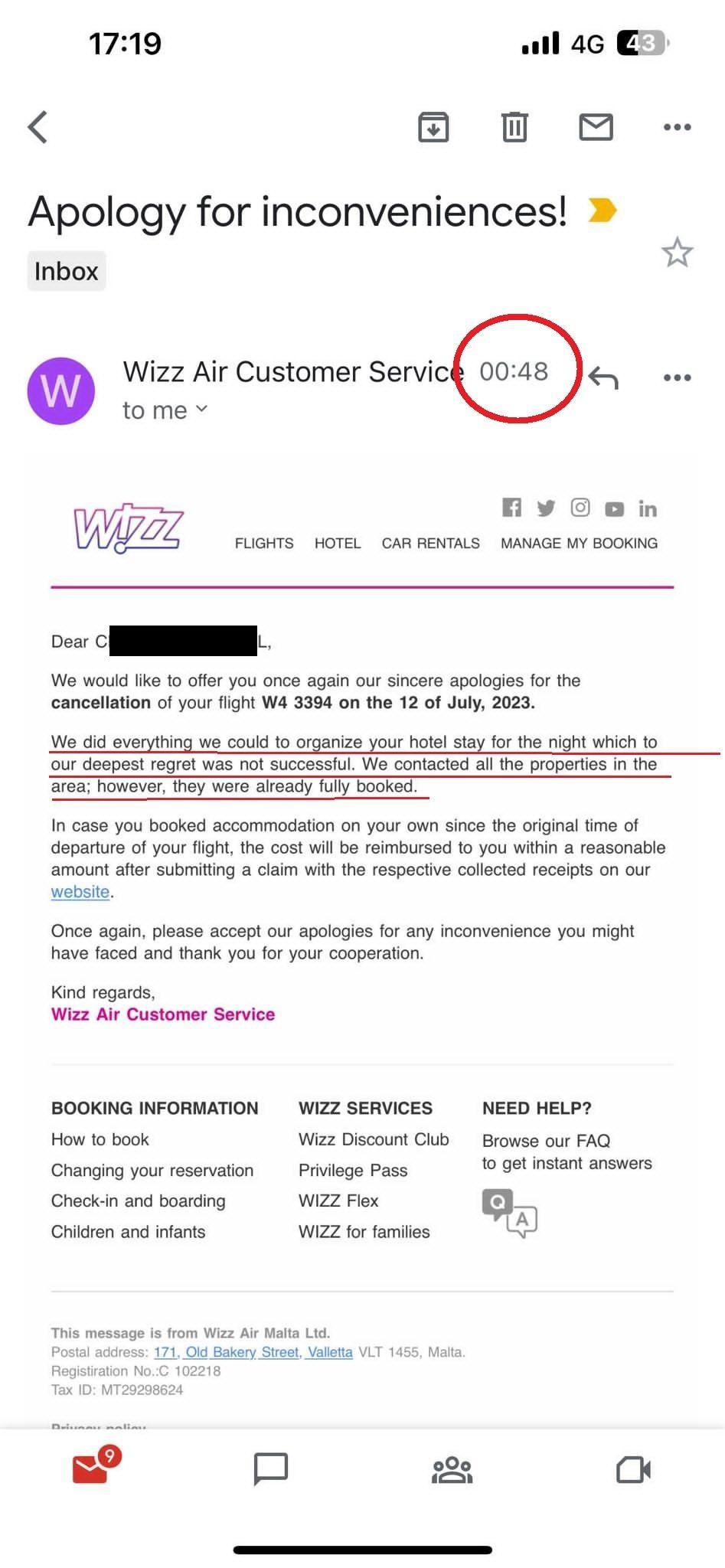 ”Pasagerii au fost notificați despre situație prin sms/e-mail și în concordantă cu regulamentele în vigoare și politica companiei pot opta pentru 120% credit de companie, rambursarea banilor achitați sau reprogramarea pe un alt zbor în limita locurilor disponibile. Din cauza indisponibilității opțiunilor de cazare, pasagerii au fost îndrumați să caute soluții individual (n.red. pasagerii spun că nu a fost așa), având ulterior opțiunea să solicite pe website-ul companiei restituirea sumei achitate, într-o valoare rezonabilă, pe baza documentelor care atestă rezervarea camerei de hotel. Wizz Air își cere scuze pasagerilor pentru orice neplăceri cauzate și reamintește că face toate eforturile posibile pentru a evita perturbările, anularea unui zbor fiind ultima opțiune după ce s-au luat toate măsurile pentru operarea sa”, au precizat cei de la Wizz Air.