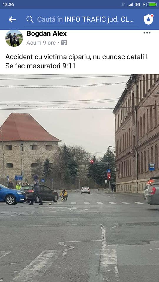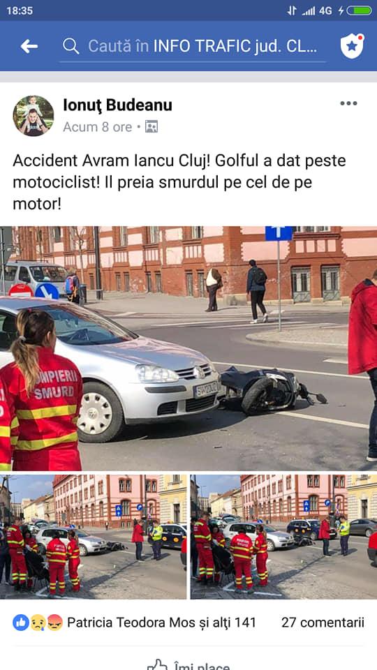 Un motociclist a fost lovit de un șofer în vârstă, care nu i-a acordat prioritate. Este al doilea accident de acest fel pentru ziua de luni, dimineață un scuterist fiind accidentat pe strada Avram Iancu. Au urmat incidente rutiere în multe puncte din oraș, dar și câteva accidente în afara municipiului.