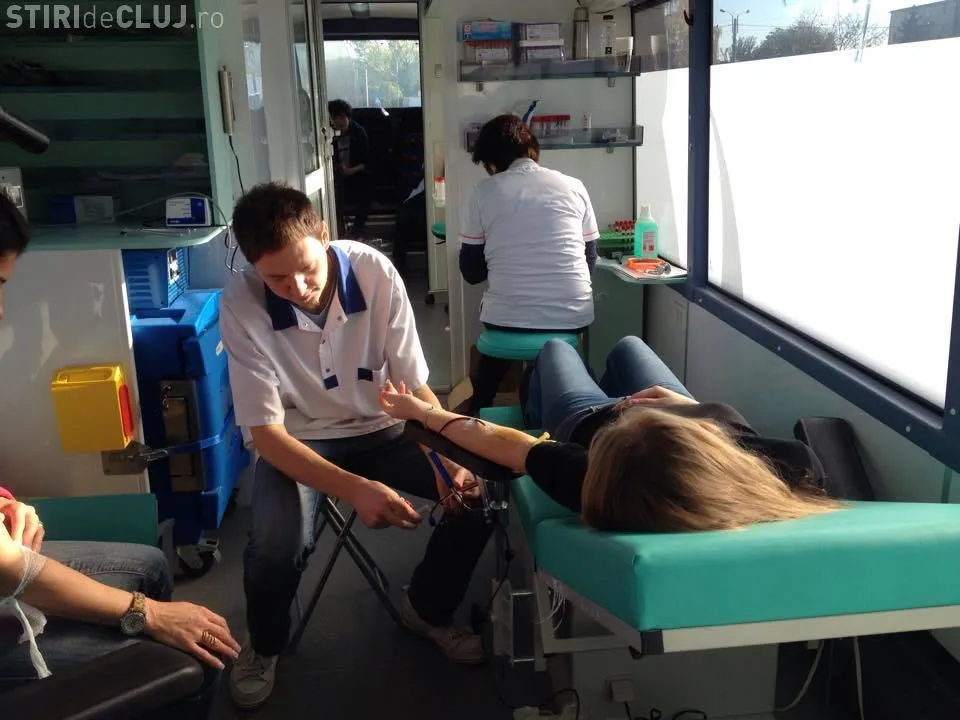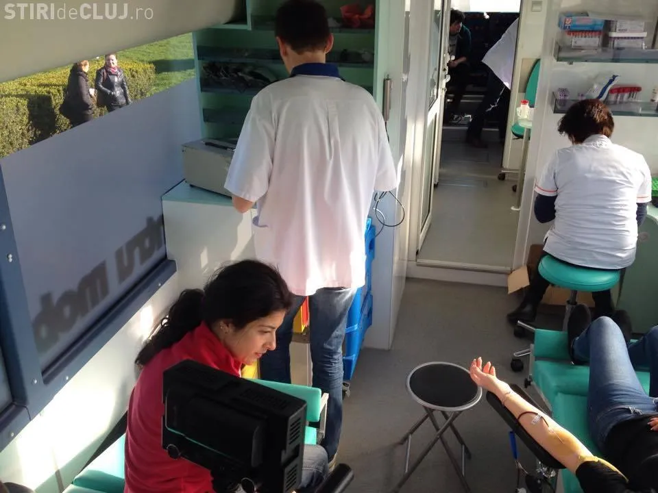 Zeci de clujeni donează sânge la un punct mobil, amplasat la Sala Sporturilor.