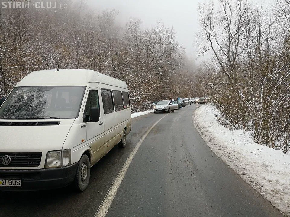 Drumul spre stațiunea Muntele Băișorii este blocat de zeci de autoturisme care nu pot înainta din cauza poleiului.
