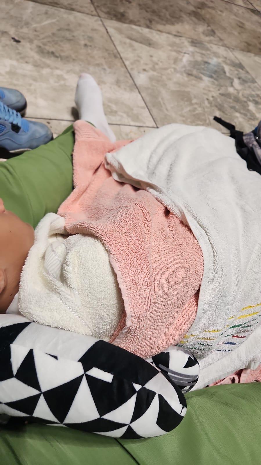 ,,Ne-au luat numele să ne găsească cazare. După 3 ore ne-au spus că nu găsesc cazare. După încă 3 ore ne-au dat un voucher de 12 euro care putea fi utilizat doar în aeroport. Suntem încă în aeroport. Am căutat și cazare dar cazările au check-inul de la ora 2. Unde să mergem la ora 5 să ne luăm cazare. Suntem cu copiii, dorm copiii pe jos. Am întins prosoapele de plajă și au dormit copiii pe jos”, relatează femeia.