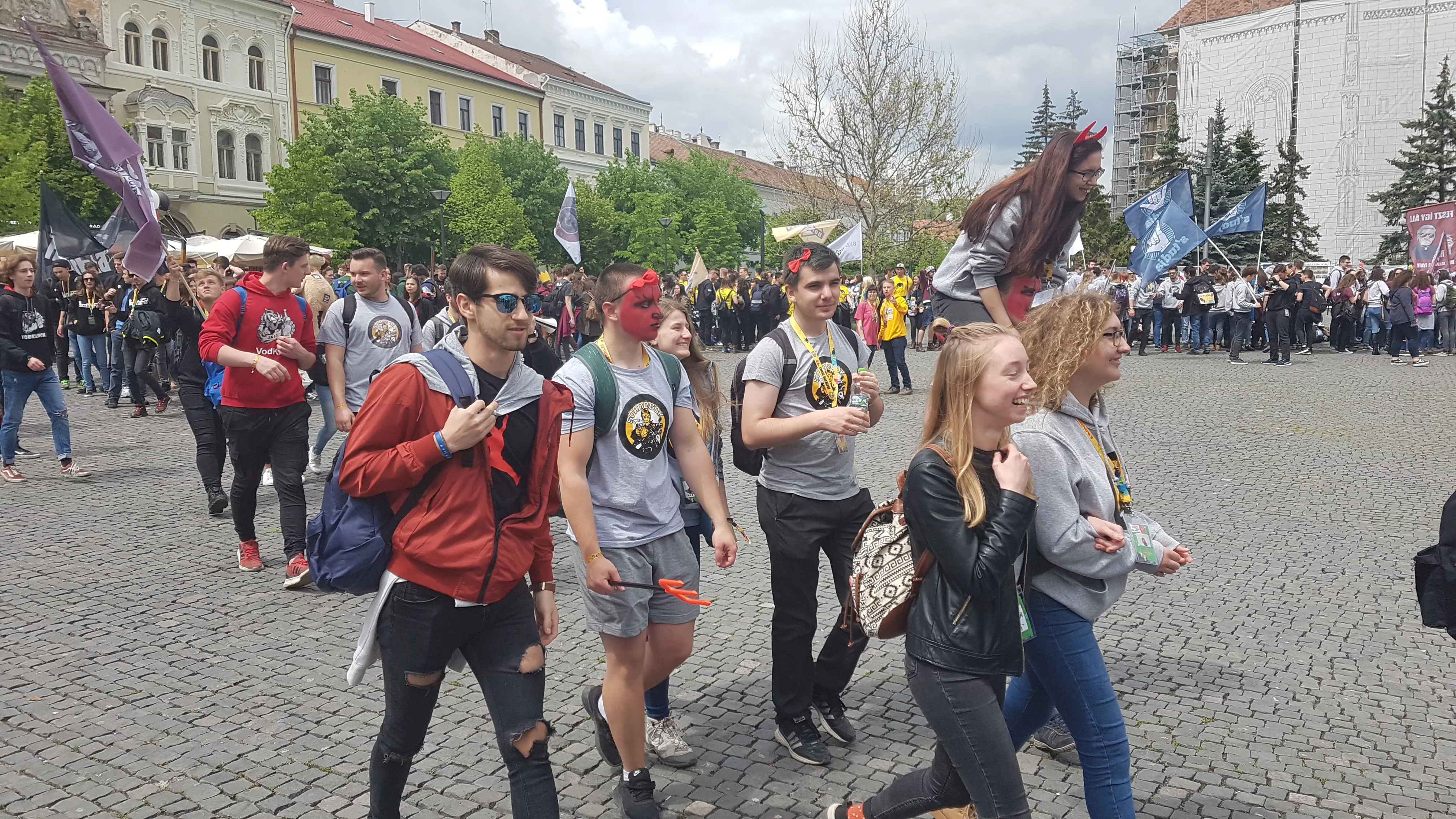 La parada din Piața Unirii, tinerii studenți au apărut costumați, au cântat și s-au distrat.