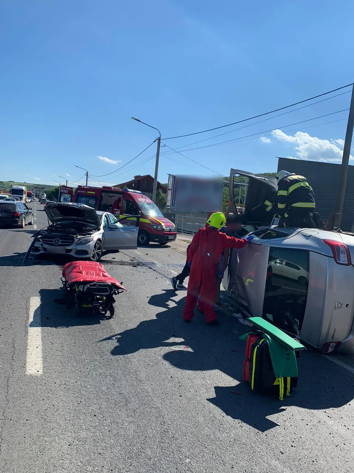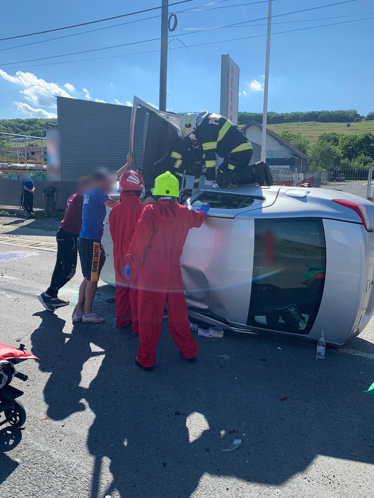 Echipajele de intervenție au găsit două autoturisme avariate, dintre care unul era răsturnat pe partea laterală și în care rămăsese blocată o femeie de circa 50 de ani.