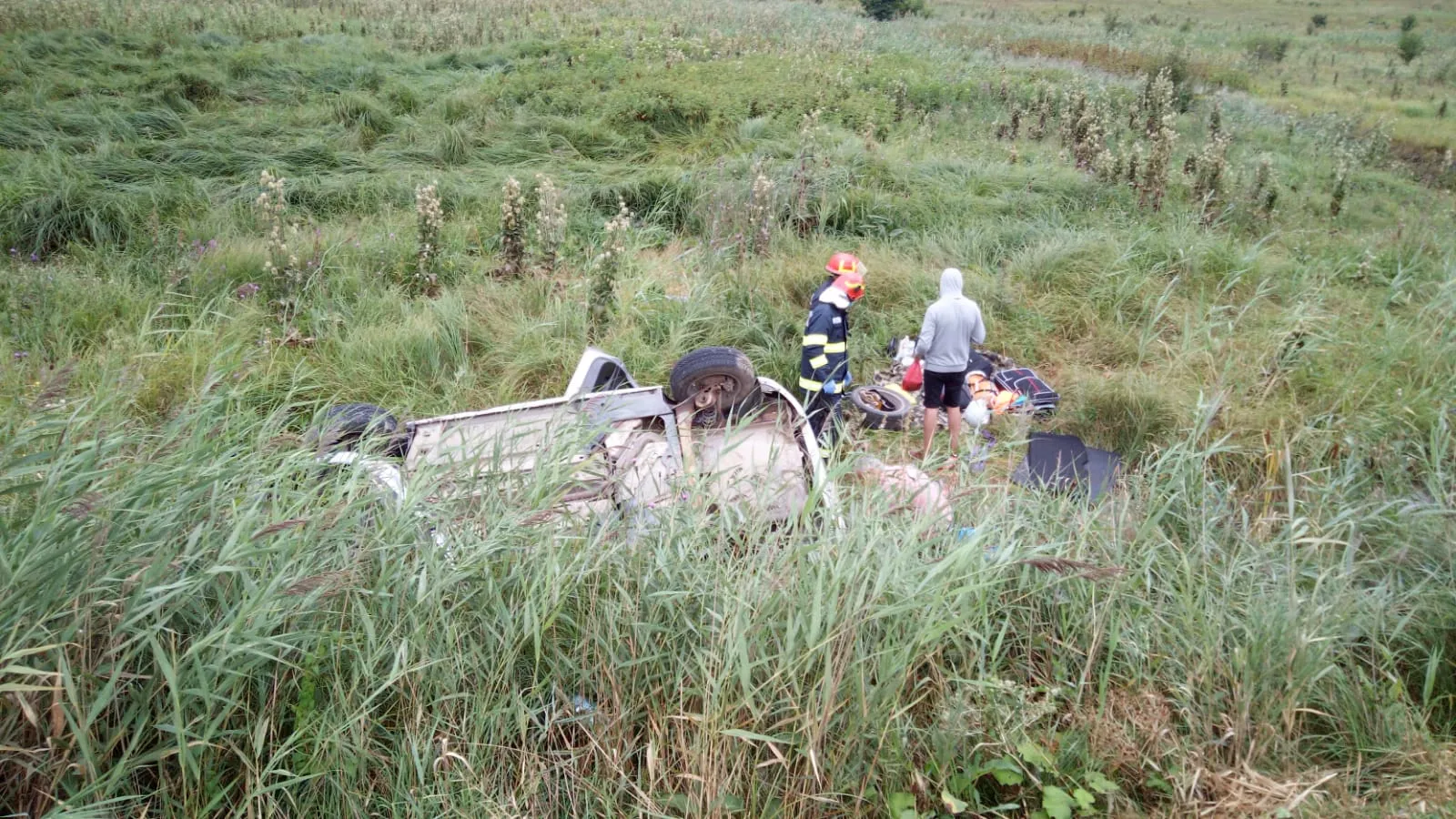 Pompierii au găsit un autoturism răsturnat pe plafon, la circa 7m față de carosabil și ocupanții ieșiți din acesta.