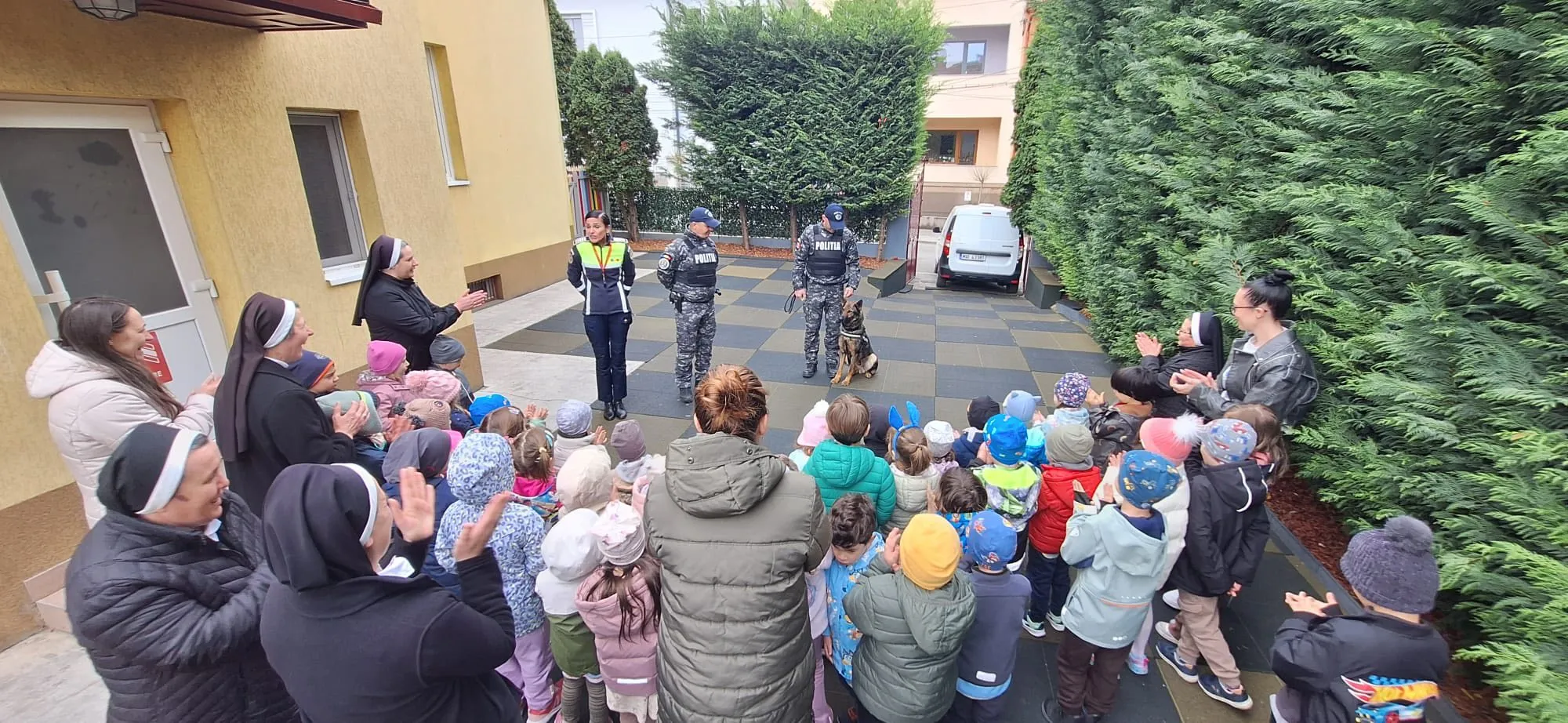 Momentul cel mai așteptat al zilei a venit spre final, când Serviciul Criminalistic al IPJ Cluj a trimis două echipaje chinotehnice la grădiniță. Copiii au avut ocazia să interacționeze direct cu câinii polițiști, să se joace alături de ei și să îi descopere mai îndeaproape — o experiență inedită care le-a tăiat imediat emoția.