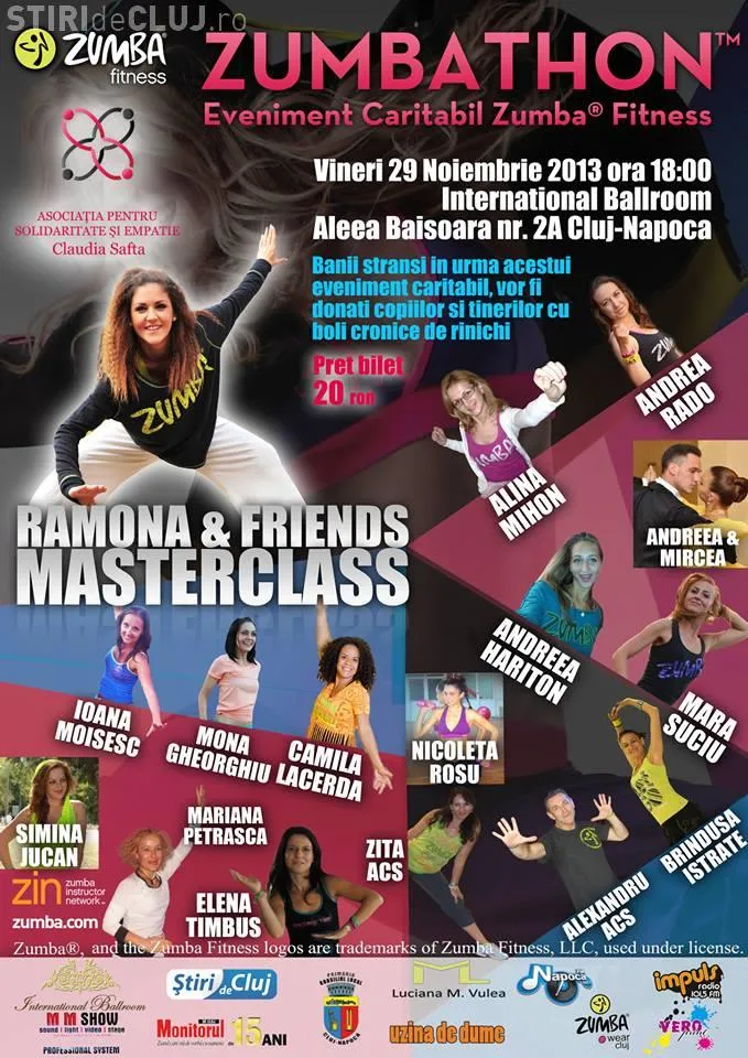 Cei mai renumiți instructori de zumba din Cluj-Napoca vor organiza vineri, 29 noiembrie, un Zumbathon - un maraton de zumba caritabil pentru copiii care suferă de insuficiență renală.