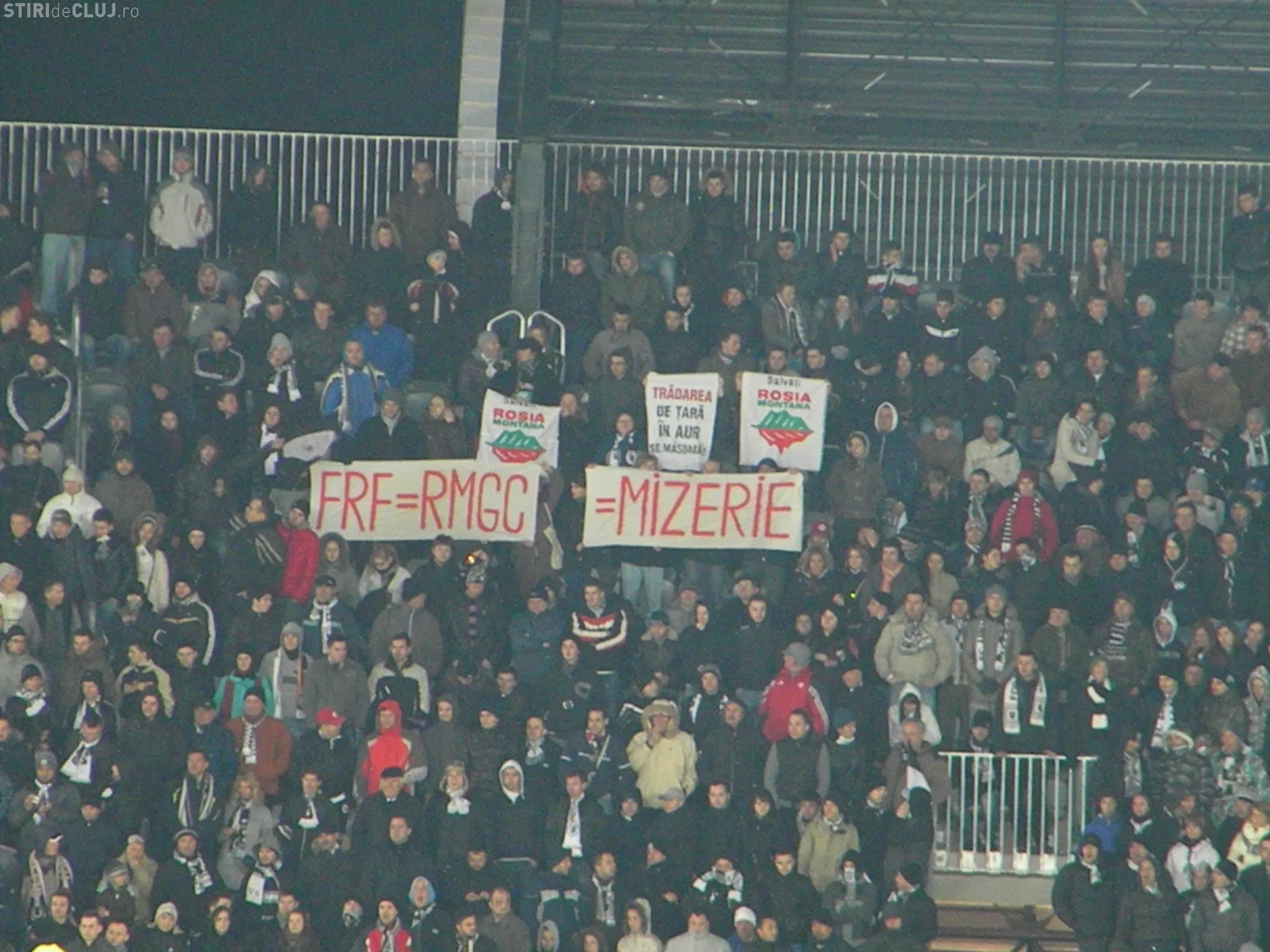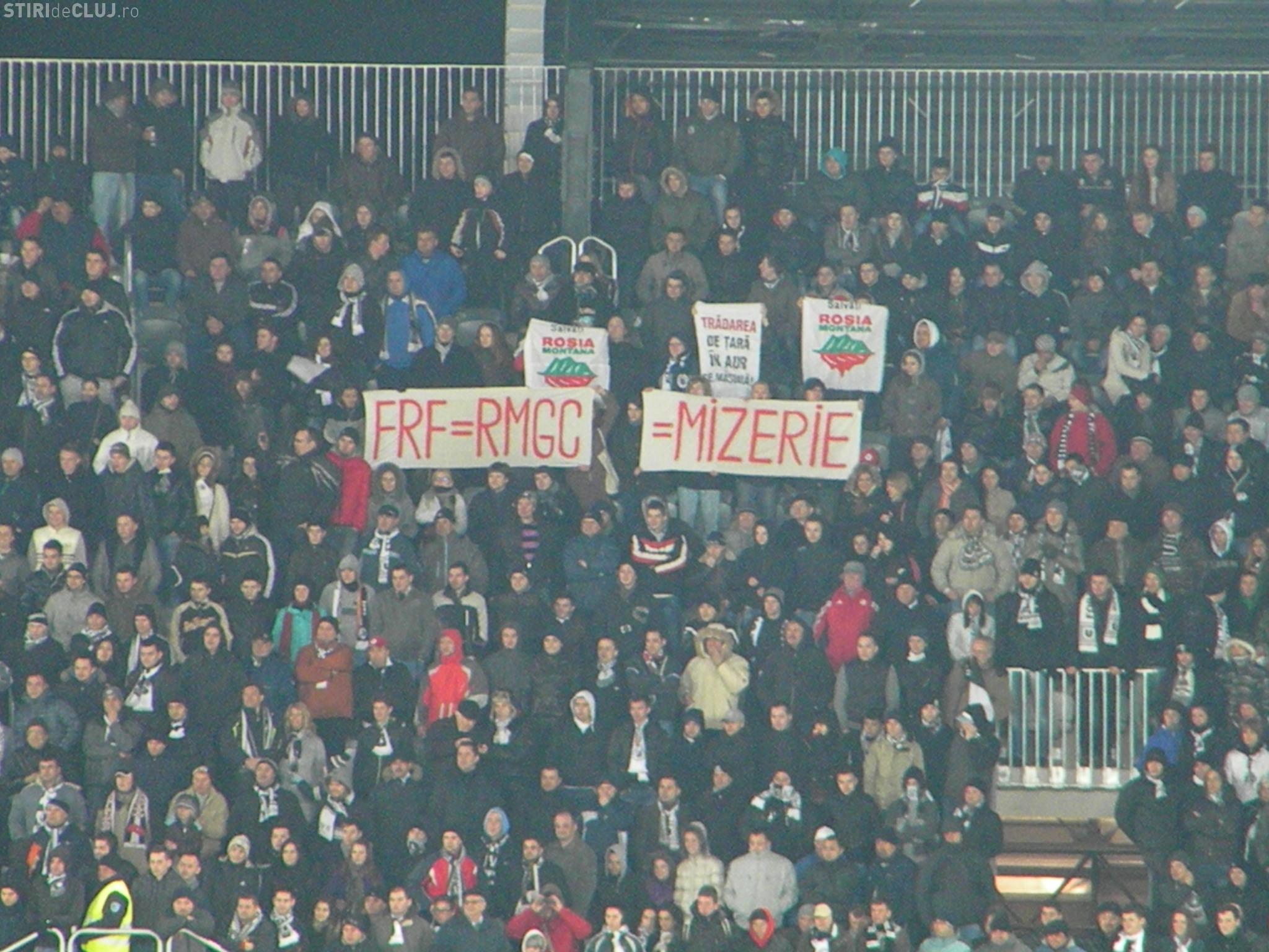 Mai multi suporteri au afisat la meciul U Cluj - Steaua un banner pe care au scris "FRF = RMGC = MIZERIE" si cateva steaguri ale activistilor Rosia Montana.