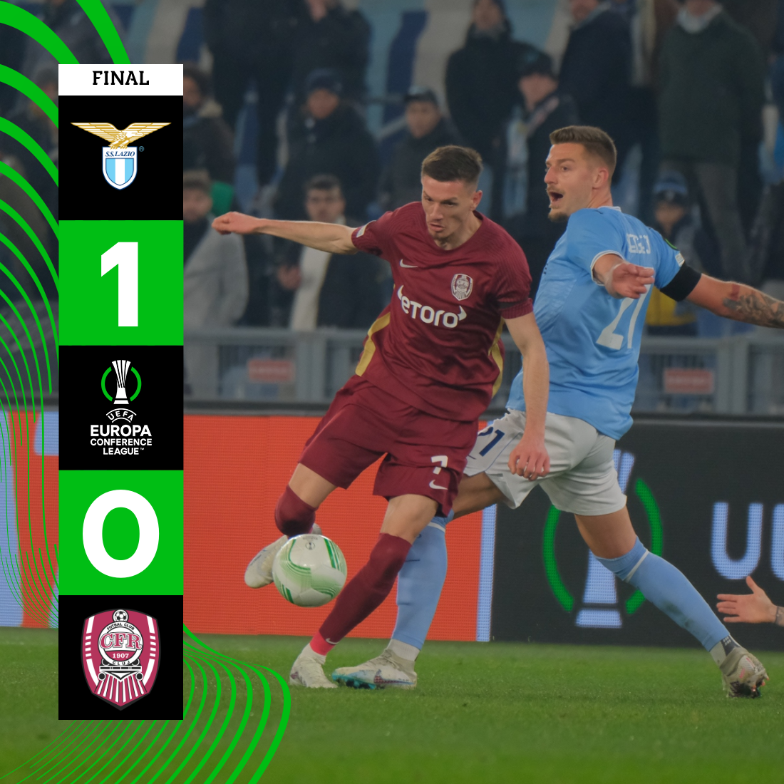CFR Cluj a fost învinsă de Lazio cu scorul de 1-0 (1-0), joi seara, pe Stadio Olimpico din Roma, în prima manşă a play-off-ului pentru optimile de finală ale Europa Conference League la fotbal. Unicul gol al partidei a fost reuşit de Ciro Immobile (45+4).