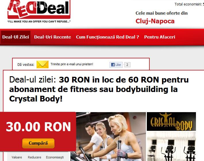 Timp de patru zile puteti achizitiona un abonament la fitness si bodybuilding la Crystal Body in Cluj-Napoca la jumatate de pret. Reducerea de la 60 de lei la 30 de lei este oferita de RedDeal si o puteti achiziona on-line.