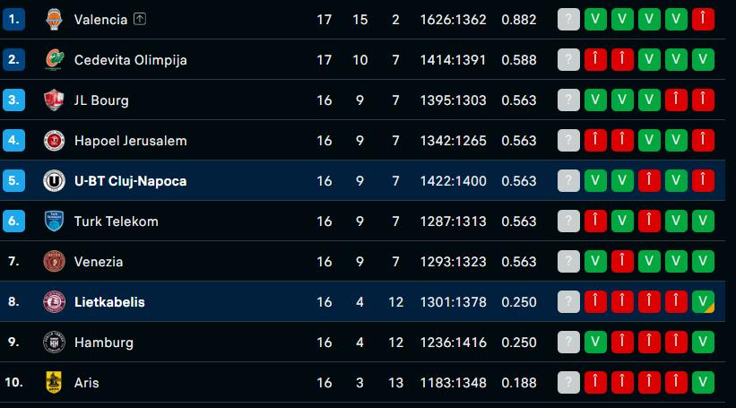 Lietkabelis nu mai are șanse să se califice în Play-Off, din moment ce a obținut numai 4 victorii și a pierdut alte 12 meciuri. În schimb, balticii nu se vor preda ușor, fiind o echipă competitivă, lucru demonstrat și în disputa cu Valencia din 14 ianuarie.