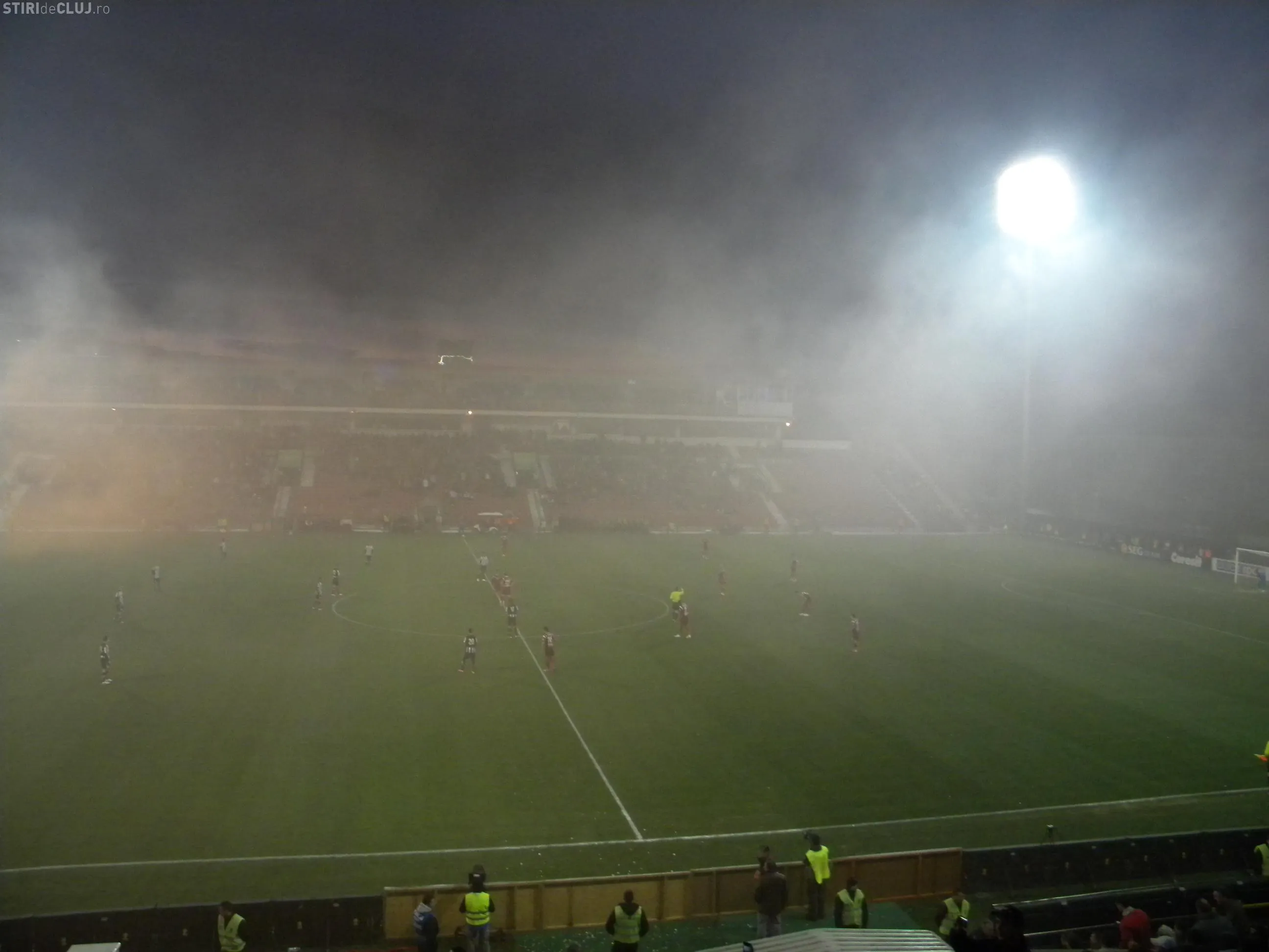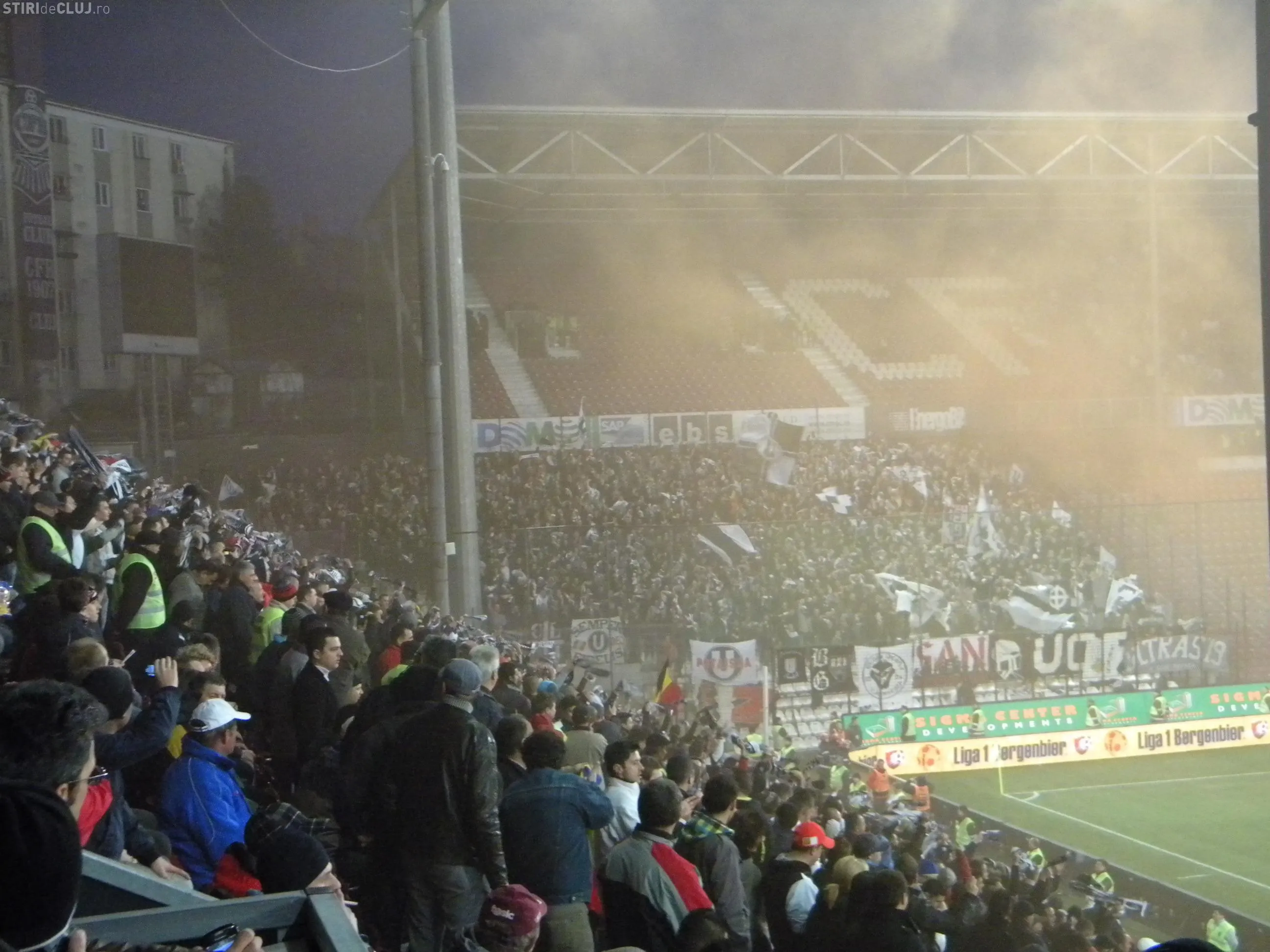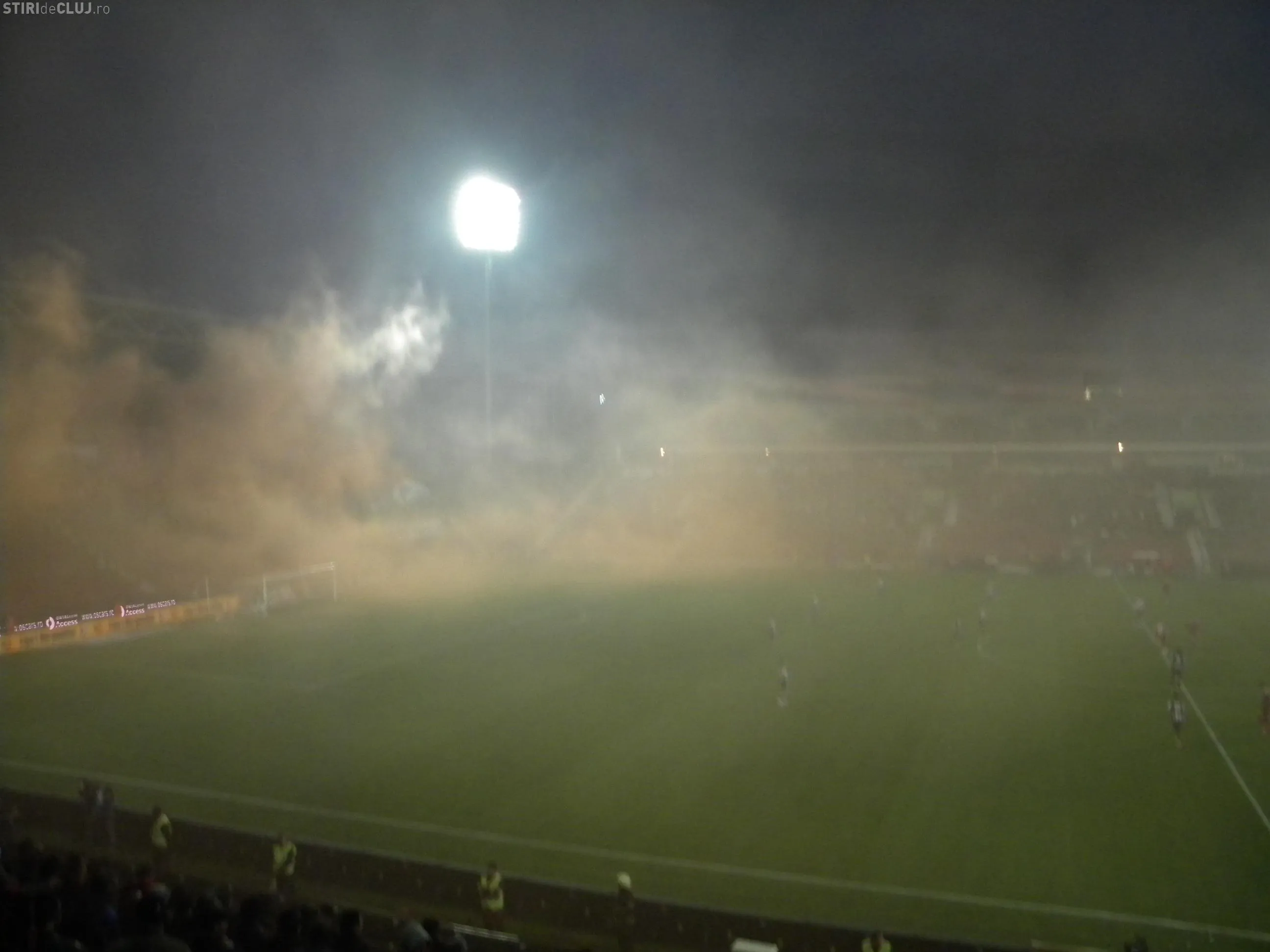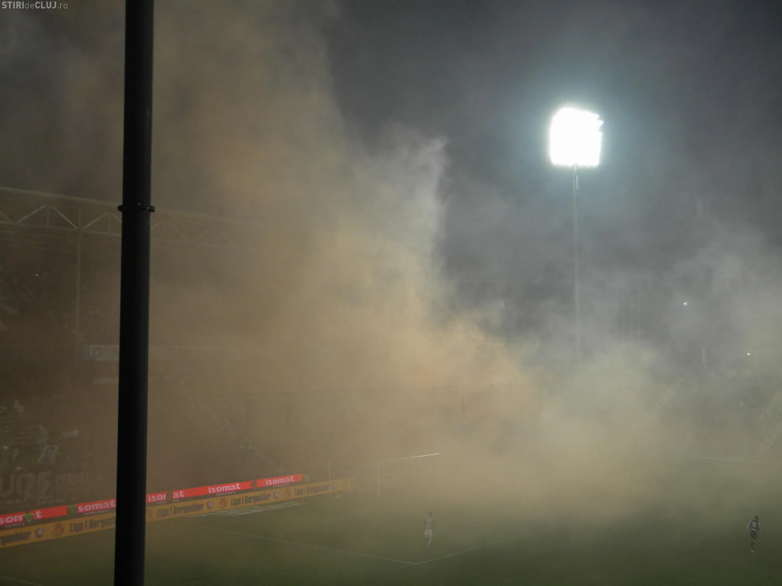 Terenul din Gruia a fost acoperit de o perdea de fum cu cateva minute inainte de inceperea partidei dintre CFR Cluj si U Cluj. Micuta galerie a "feroviarilor" au introdus pe ascuns petarde si fumigene in tribune.