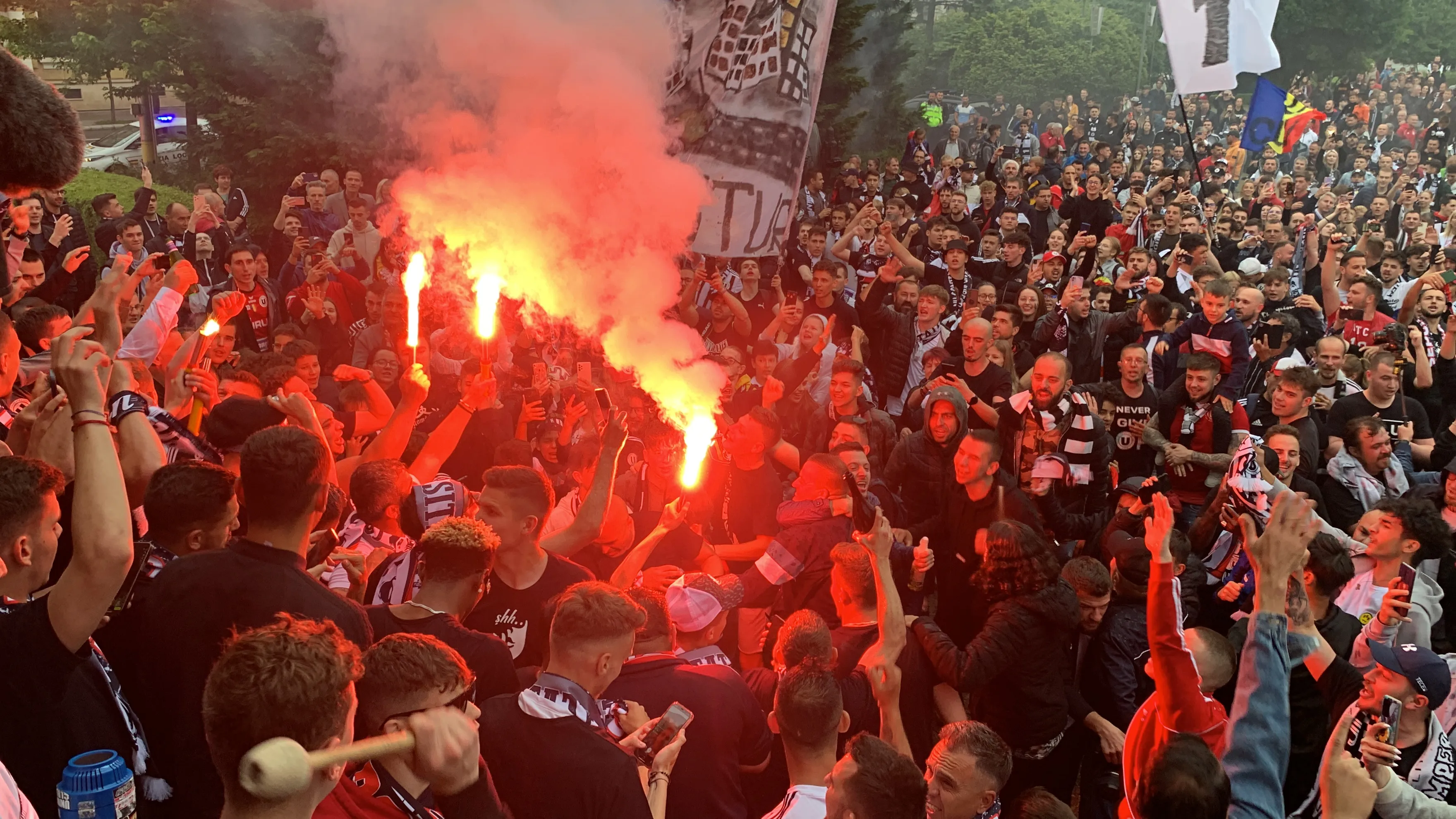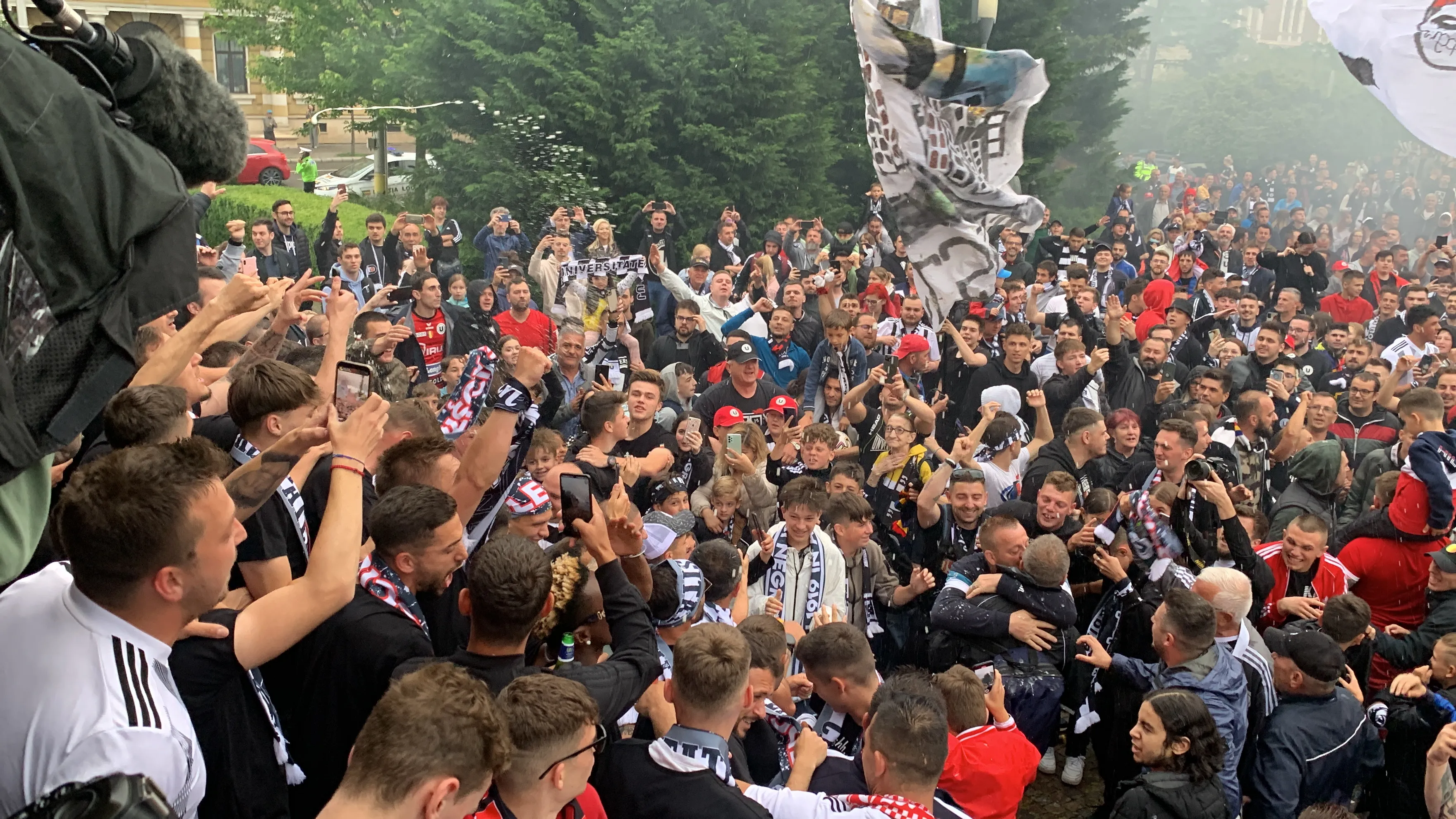 Jucătorii s-au alăturat fanilor, au cântat și au băut bere. Au fost cântate imnurile echipei intr-un singur glas, cel am promovării in prima liga. A fost scandat numele antrenorului Erik Lincar, dar au fost înjurați și rivalii de la CFR Cluj și Steaua.
