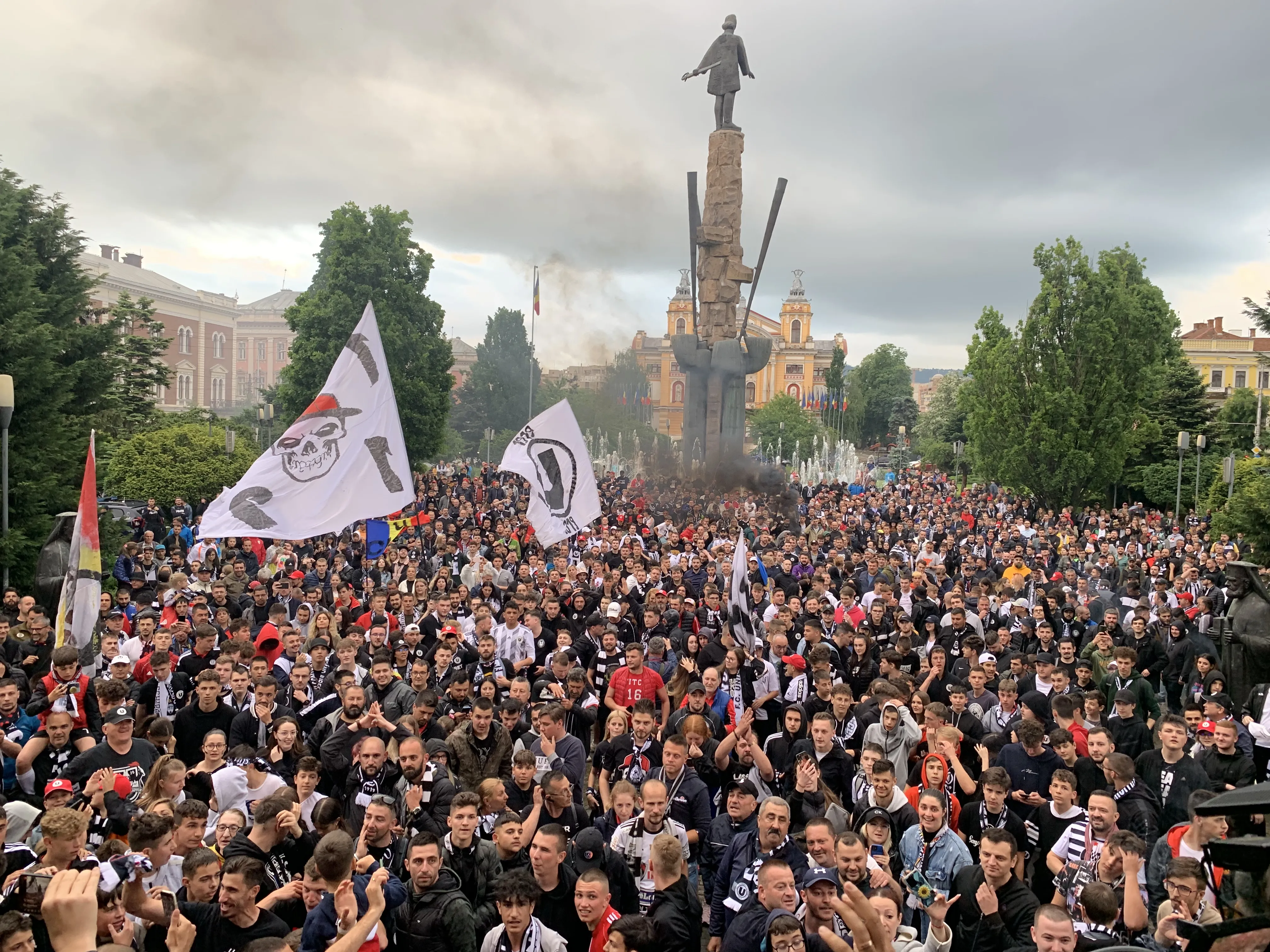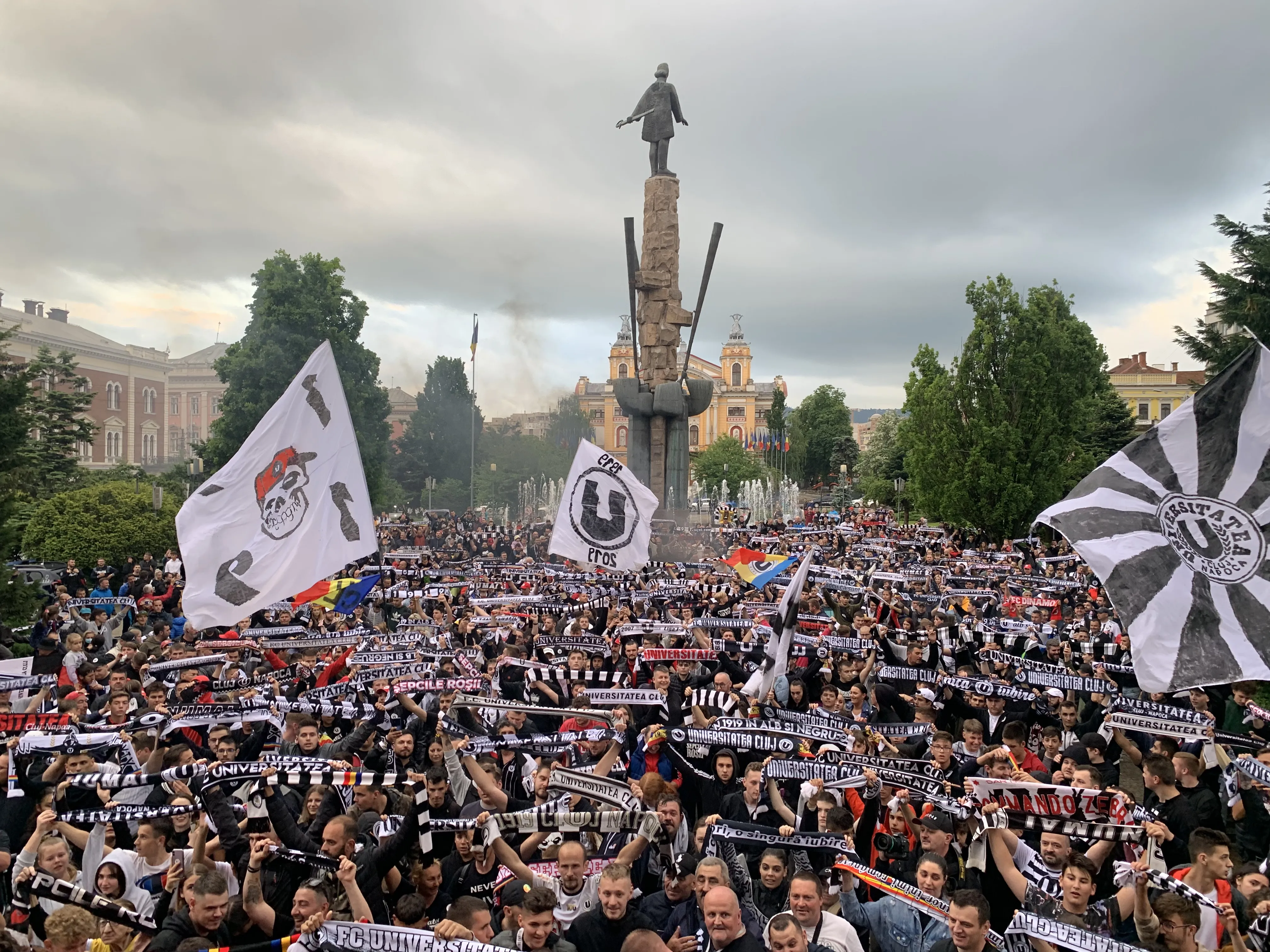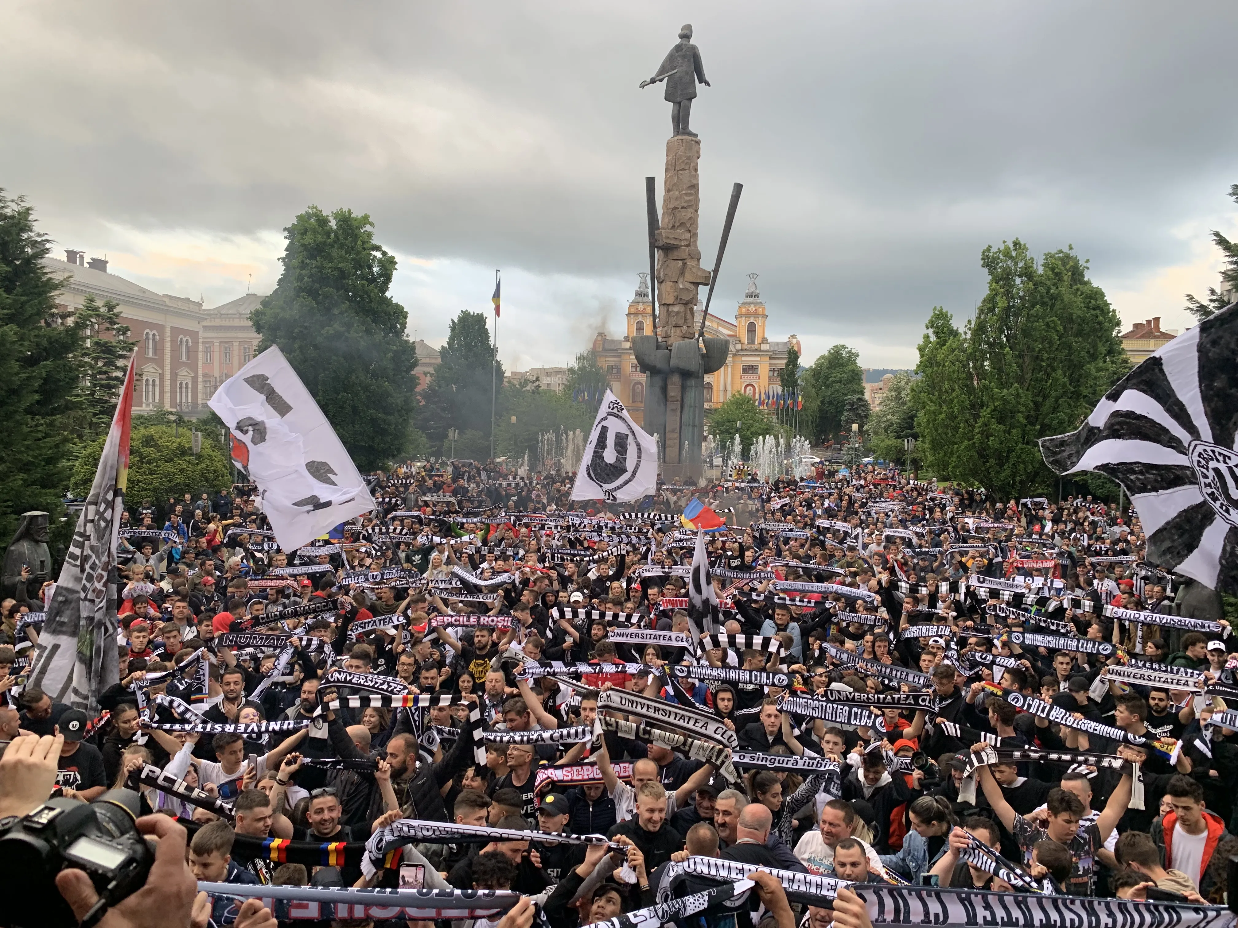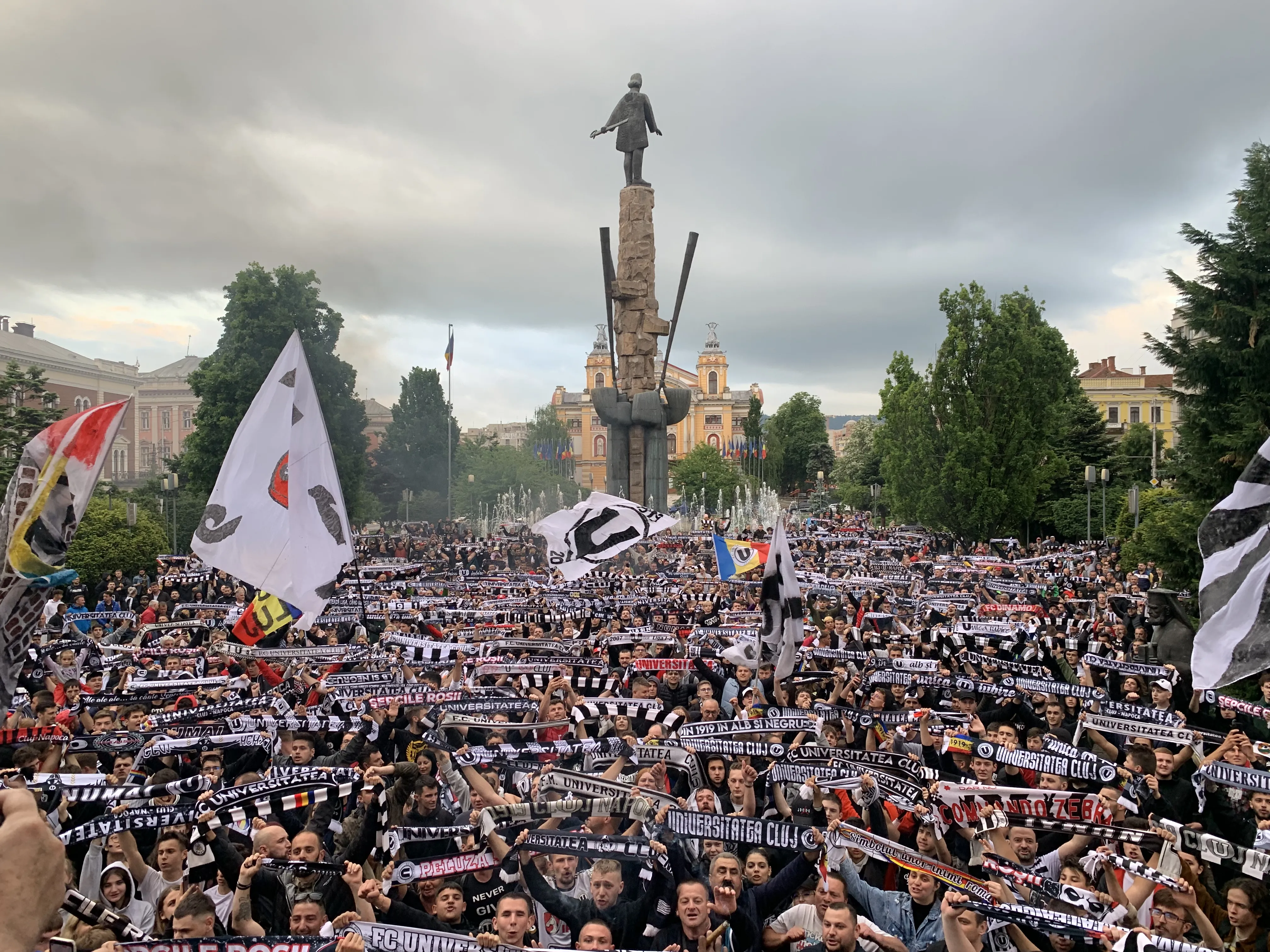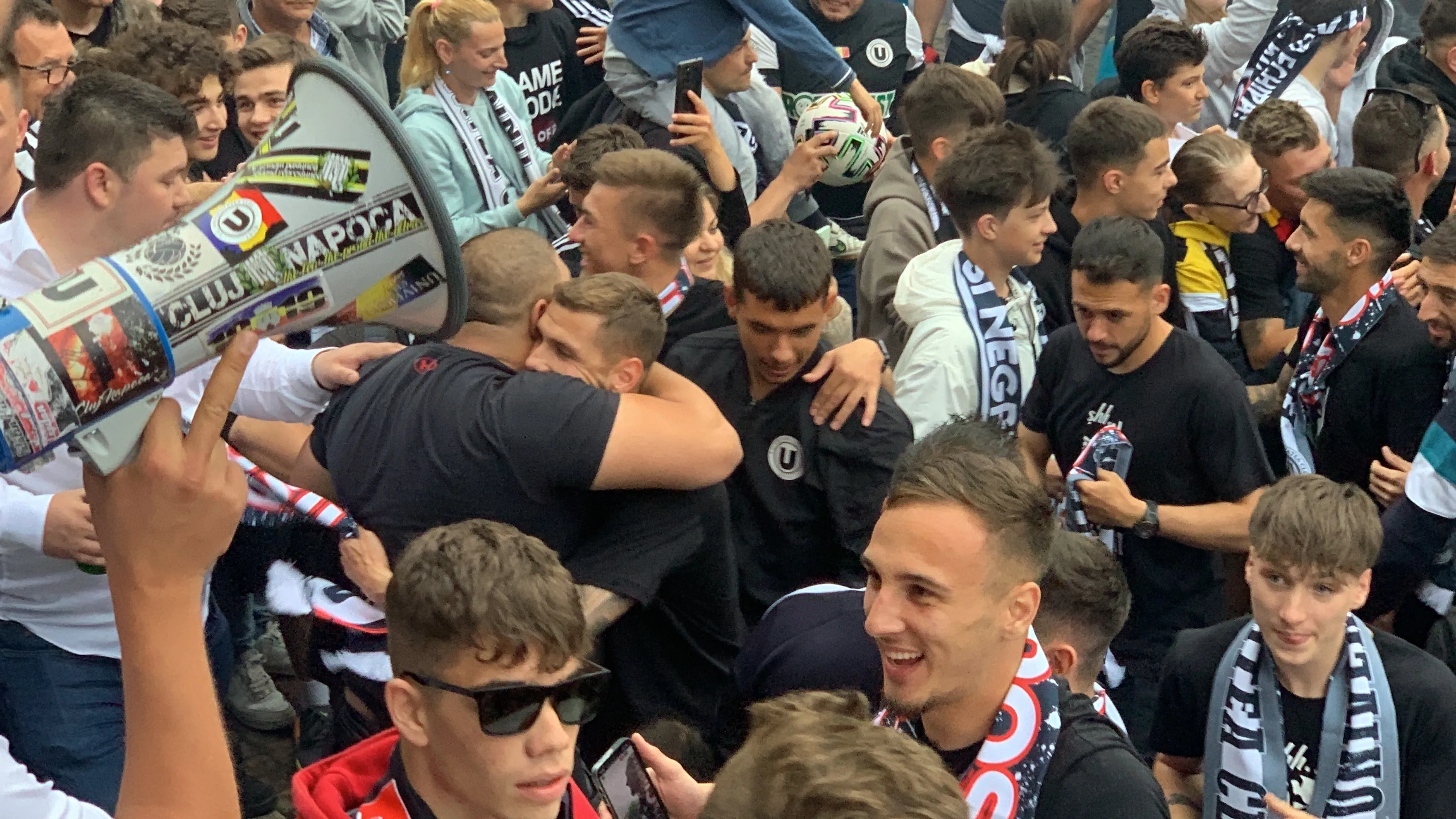 Suporterii U Cluj au invadat, luni seara, Piața Avram Iancu, din Cluj-Napoca, pentru a sărbători promovarea în Liga 1, alături de jucători. Fanii s-au adunat în Piață încă de la ora 19:19, iar jucătorii au ajuns la ora 20:00, moment în care a izbucnit nebunia.