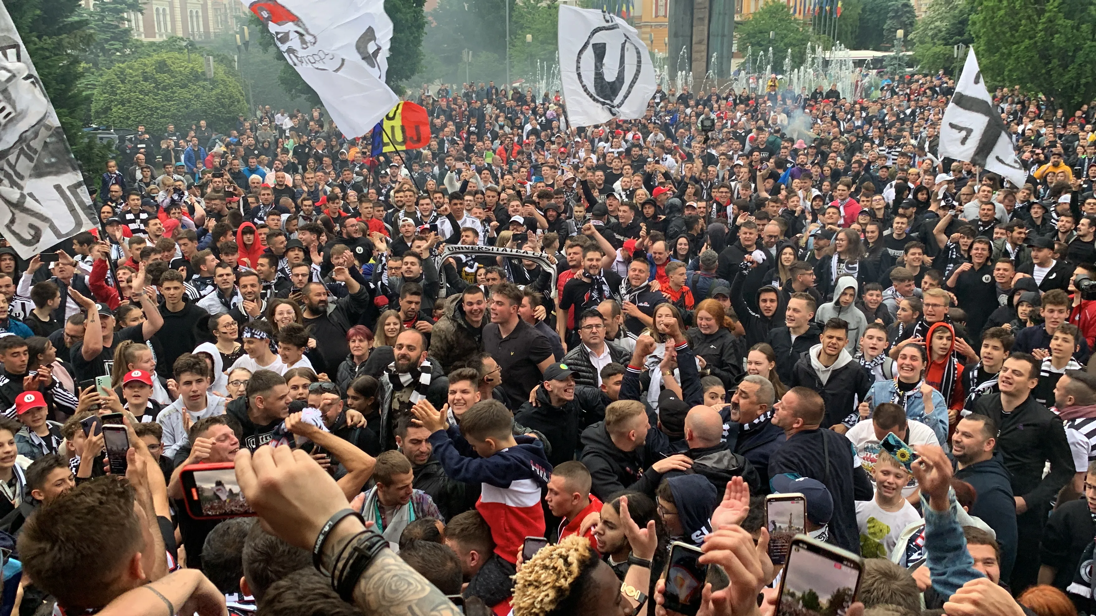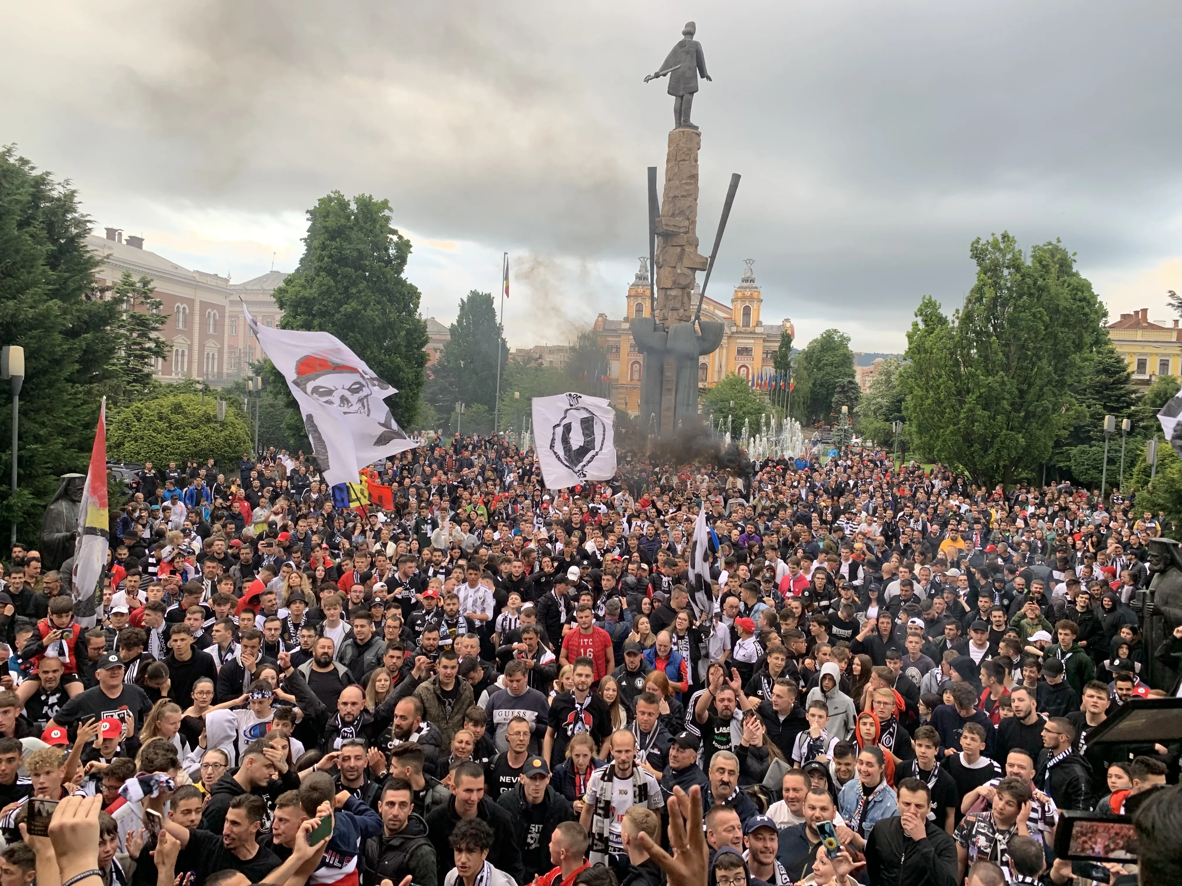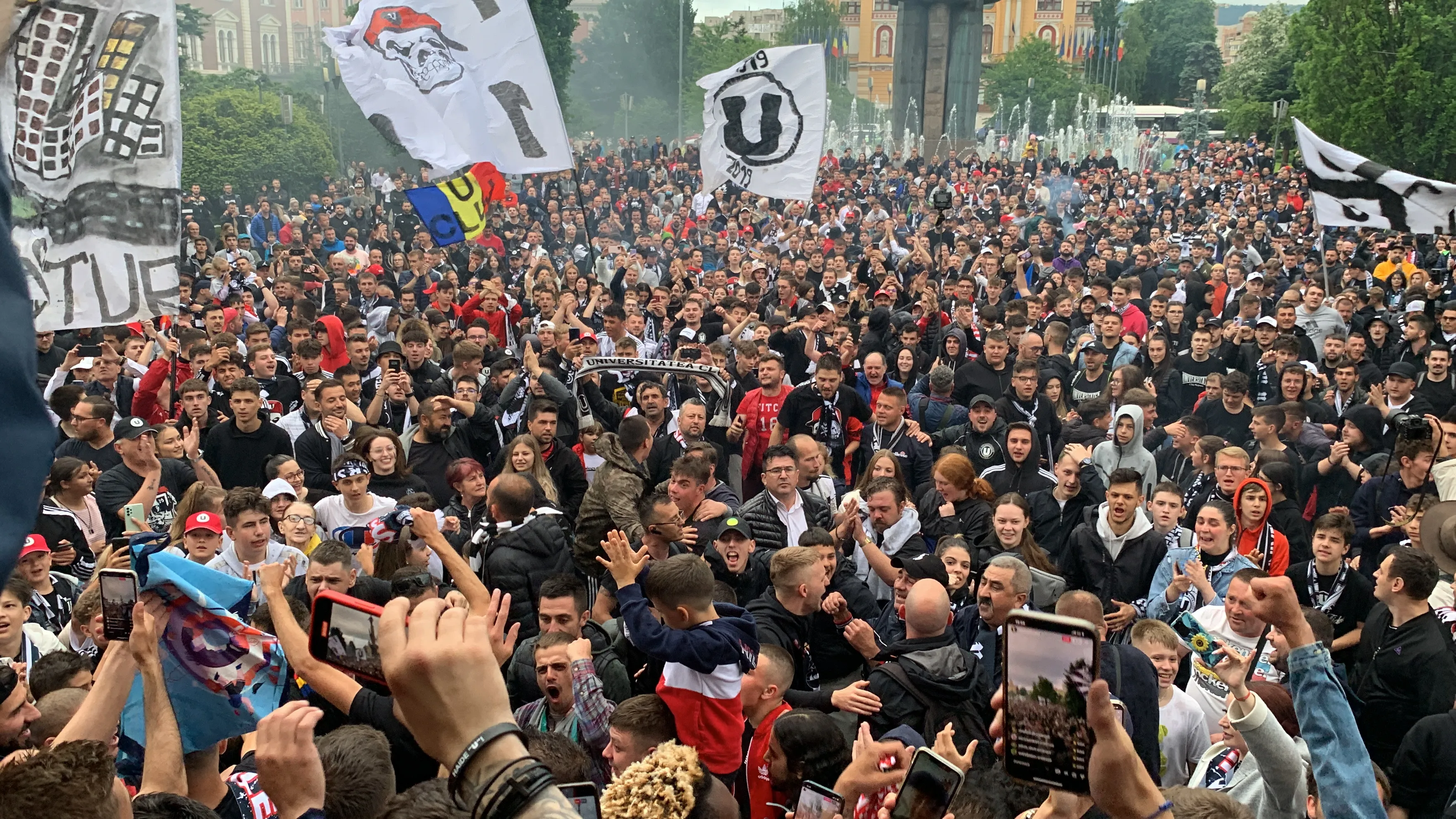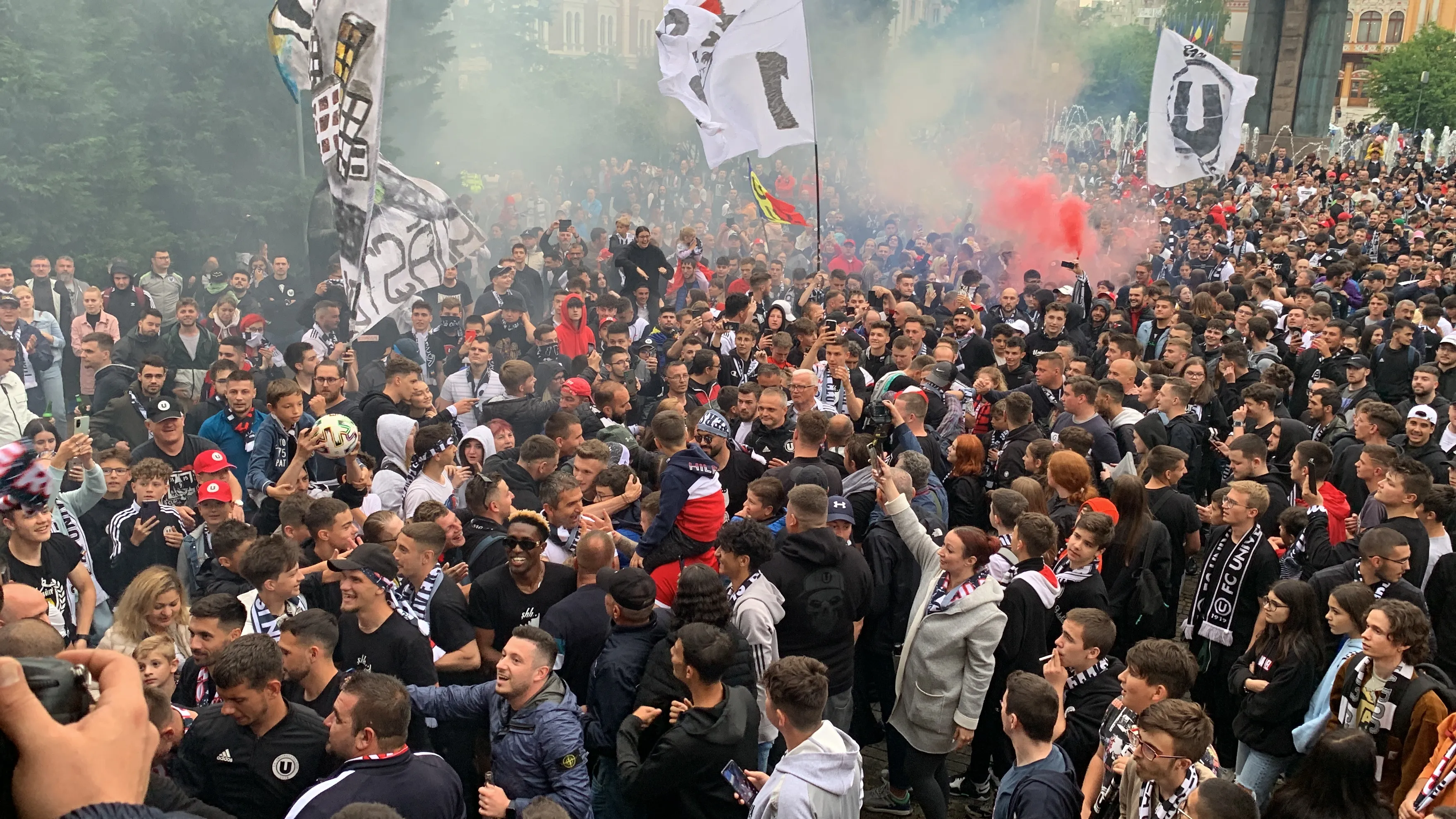 Suporterii U Cluj au invadat, luni seara, Piața Avram Iancu, din Cluj-Napoca, pentru a sărbători promovarea în Liga 1, alături de jucători. Fanii s-au adunat în Piață încă de la ora 19:19, iar jucătorii au ajuns la ora 20:00, moment în care a izbucnit nebunia.